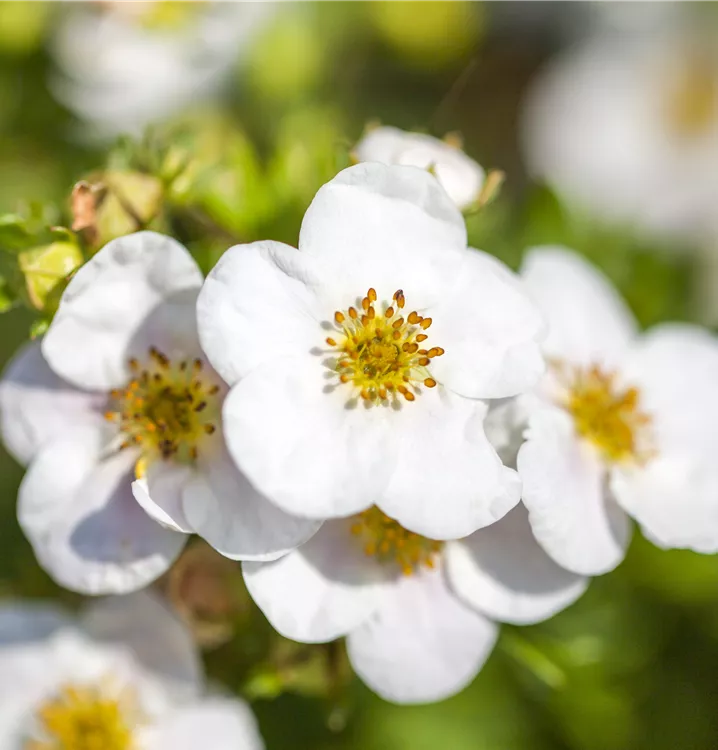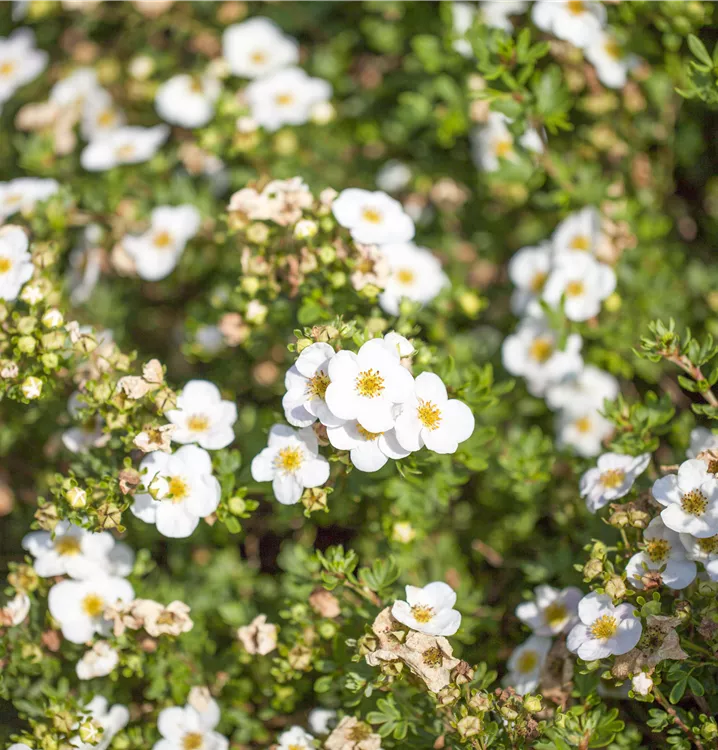 Der Fingerstrauch 'Abbotswood' (Potentilla fruticosa) ist ein buschiger, breiter Kleinstrauch, der weiße, schalenförmige Blüten hervorbringt. Sie erscheinen von Juni bis Oktober. Zudem trägt der Fingerstrauch 'Abbotswood', gefingerte, hellgrüne Blätter. An einem sonnigen bis halbschattigen Standort mit durchlässigem Boden erreicht er gewöhnlich eine Höhe von ca. 1 m und wird ca. 1,3 m breit.