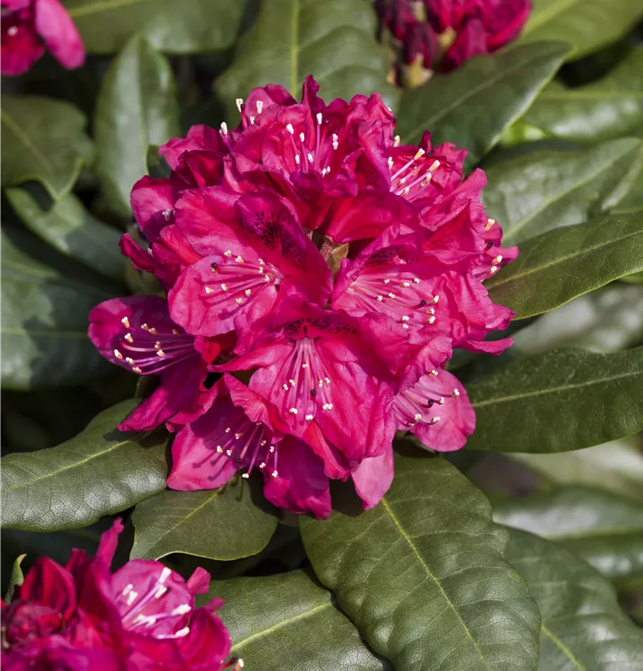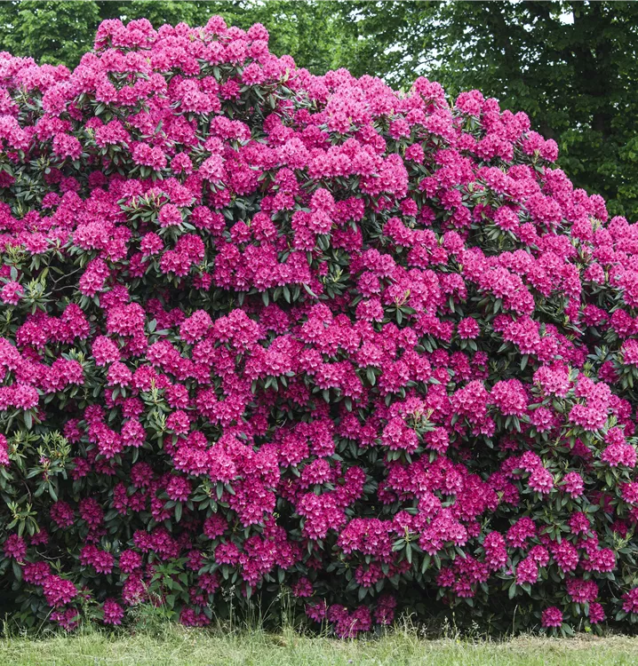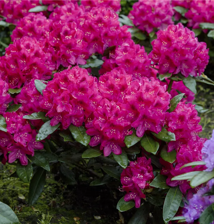 Der Rhododendron 'Nova Zembla' (Rhododendron) bringt von Ende Mai bis Mitte Juni ein wahres Meer aus purpurroten Blüten mit schwarzer Zeichnung hervor. Sein immergrünes Laub ist dunkelgrün. Dieses breit, locker wachsende Gehölz erreicht gewöhnlich eine Höhe von 1,5 - 2 m und eine Breite von 1,5 bis 2,5 m. Ein halbschattiger (bis schattiger) Standort und ein humoser, kalkfreier Boden schaffen optimale Bedingungen für ein gesundes Wachstum. Der Rhododendron 'Nova Zembla' ist gut frostverträglich.