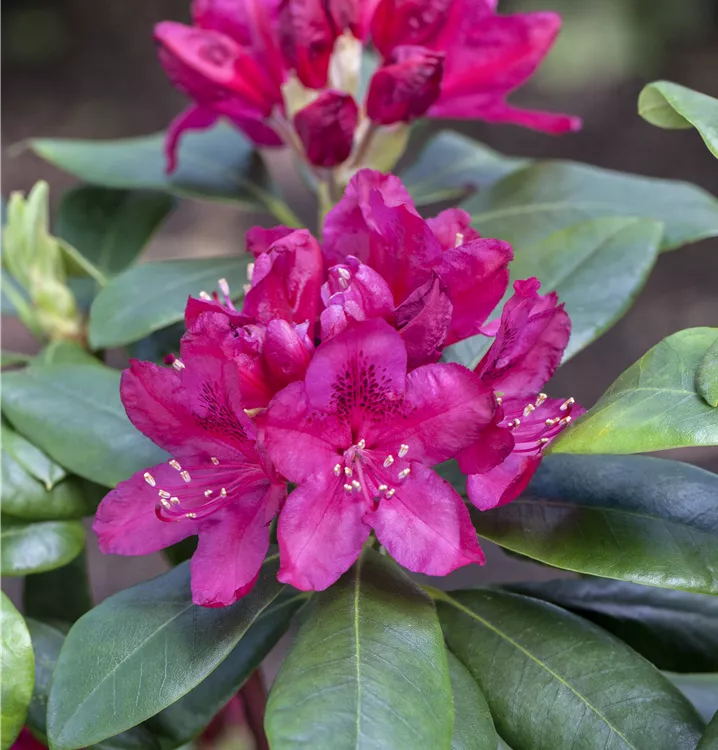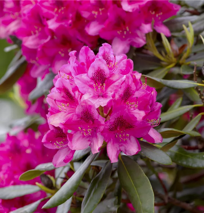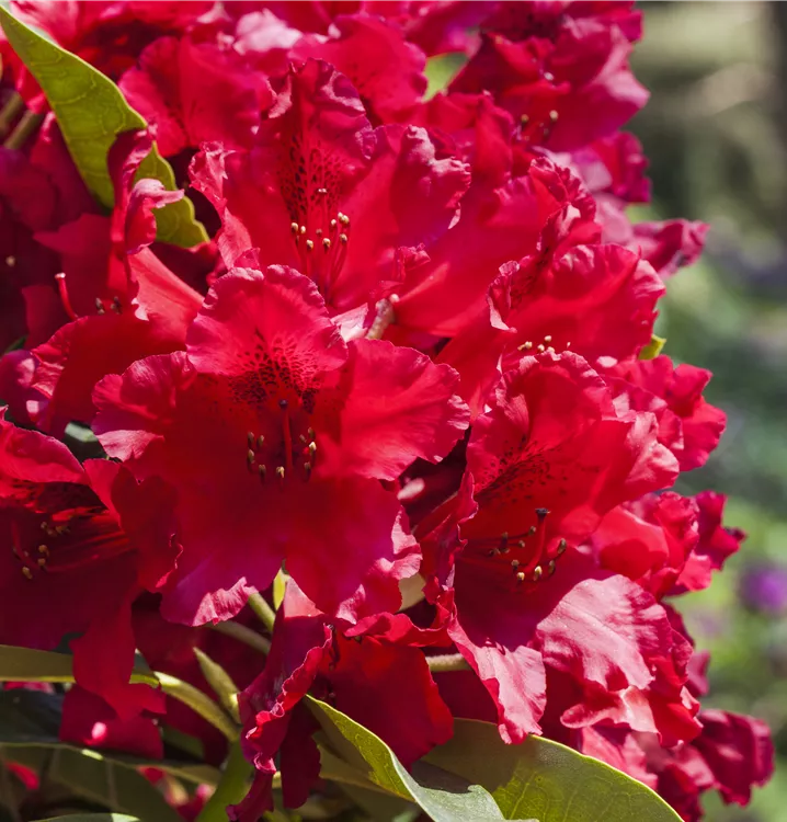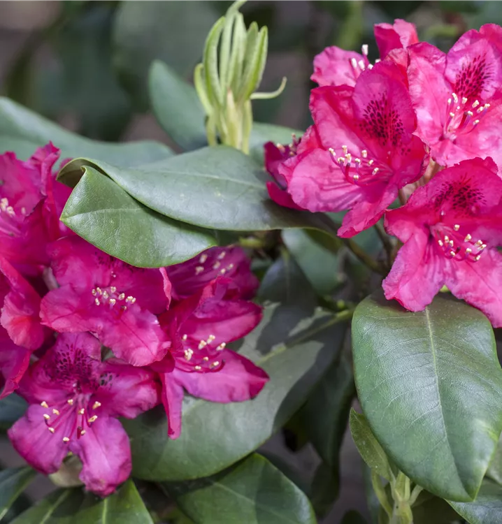 Rhododendron 'Nova Zembla' bringt von Ende Mai bis Mitte Juni purpurrote, schwarze Zeichnung, trichterförmige, in Dolden angeordnete Blüten hervor.