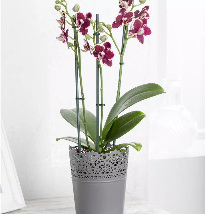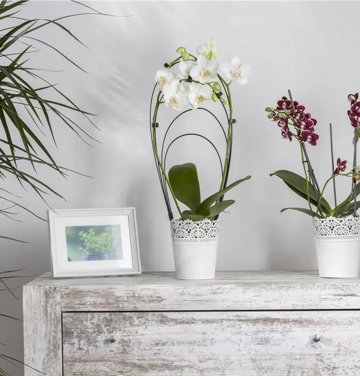 Die Schmetterlingsorchidee (Phalaenopsis) ist eine schöne, in weiß, rosa, hellgelb, pink oder dunkelrot blühende Orchidee. Ihre lippenförmigen Blüten sind sehr dekorativ und erscheinen in Rispen von Januar bis Dezember. Mit ihrem aufrechten Wuchs wird sie bis zu 50 cm hoch und 50 cm breit. Für das optimale Wachstum sorgen ein heller Standort sowie eine möglichst durchlässige und lockere Erde.