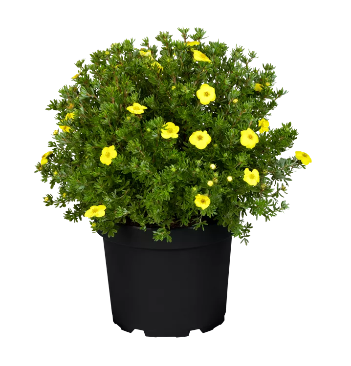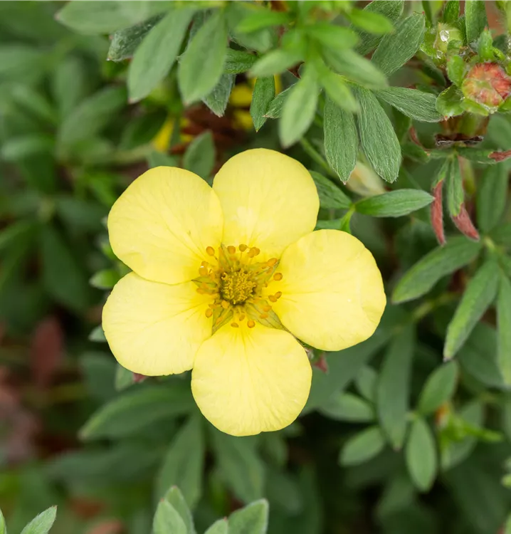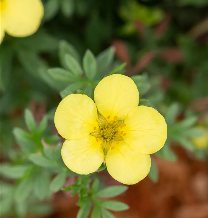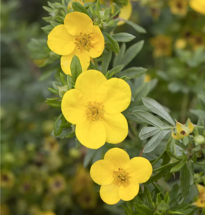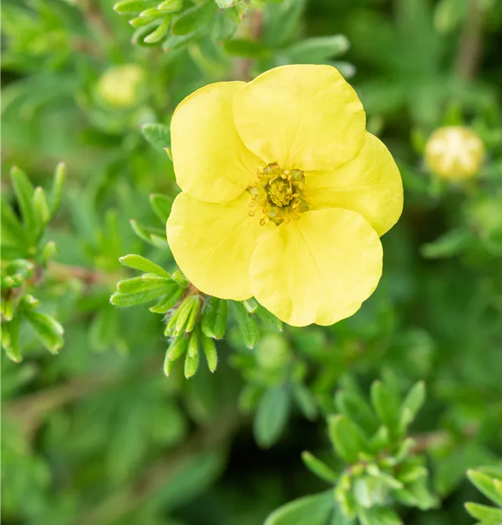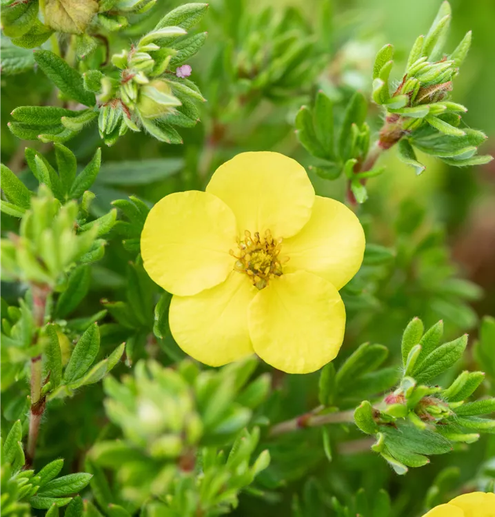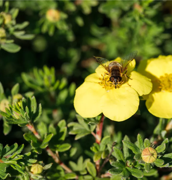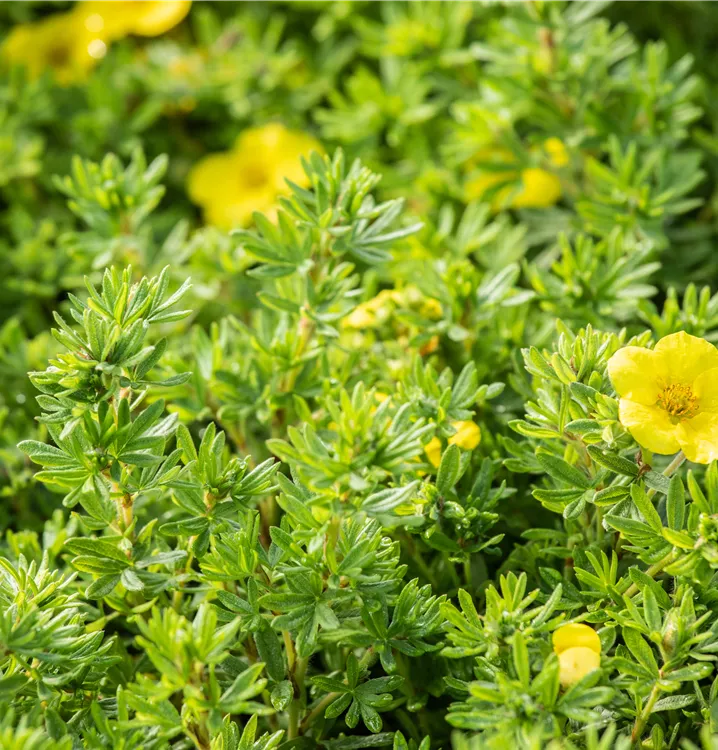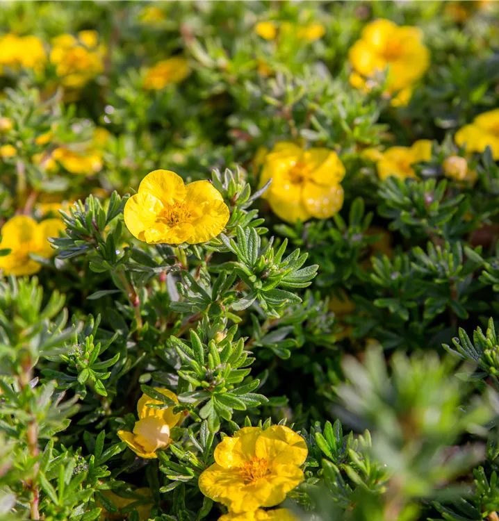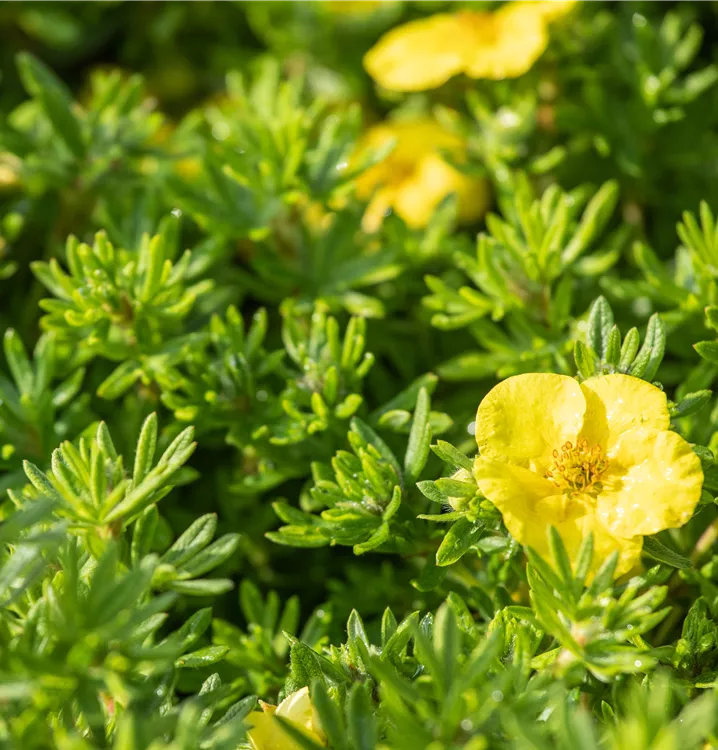 Der Fingerstrauch 'Kobold' (Potentilla fruticosa) ist ein kompakter, kugelförmiger Kleinstrauch, der gelbe, schalenförmige Blüten hervorbringt. Sie erscheinen von Juni bis Oktober. Zudem trägt der Fingerstrauch 'Kobold', gefingerte, hellgrüne Blätter. An einem sonnigen bis halbschattigen Standort mit durchlässigem, nährstoffreichem, schwachsaurem Boden erreicht er gewöhnlich eine Höhe von ca. 80 cm und wird ca. 1,3 m breit.