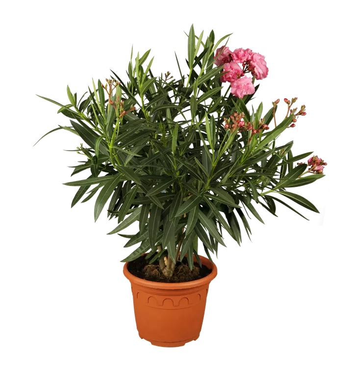 Nerium oleander bildet rosafarbene, weiße, gelbe Blüten ab Juni.
