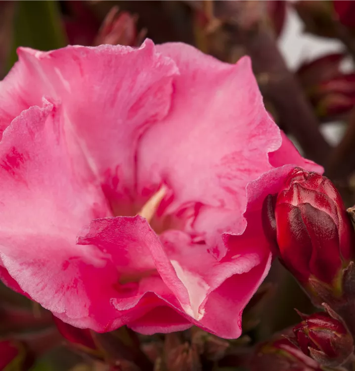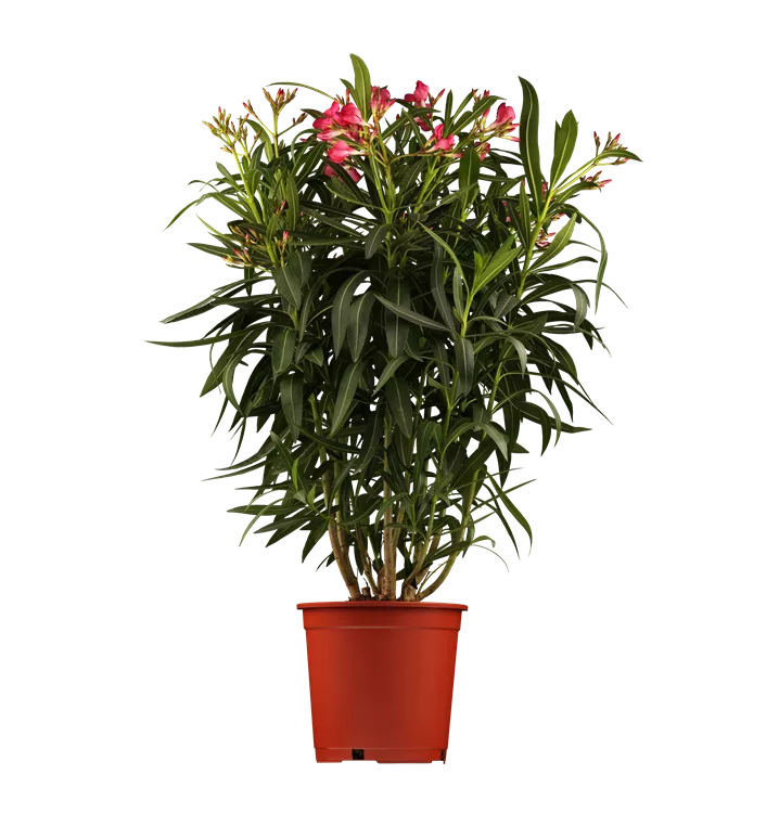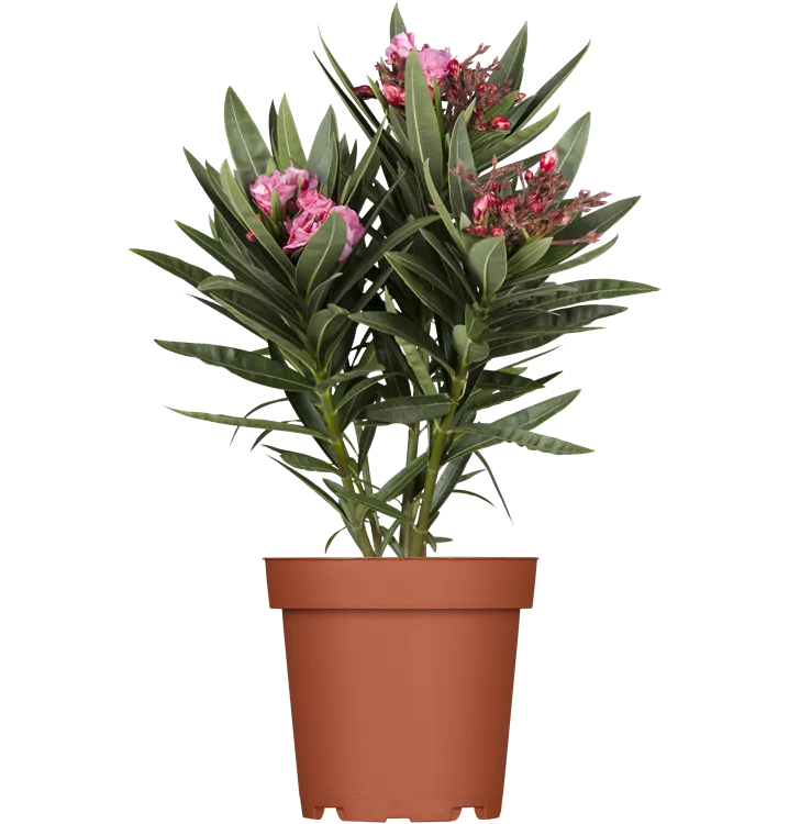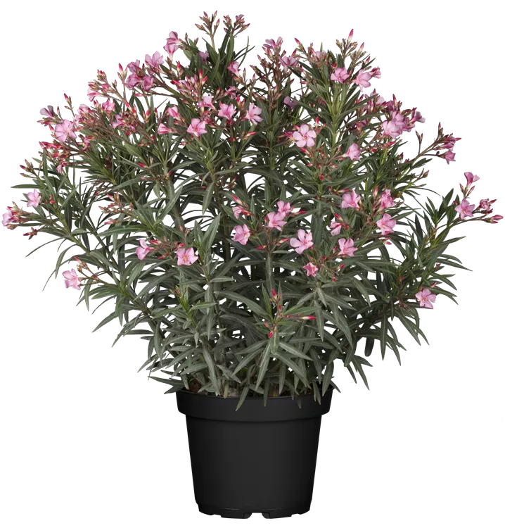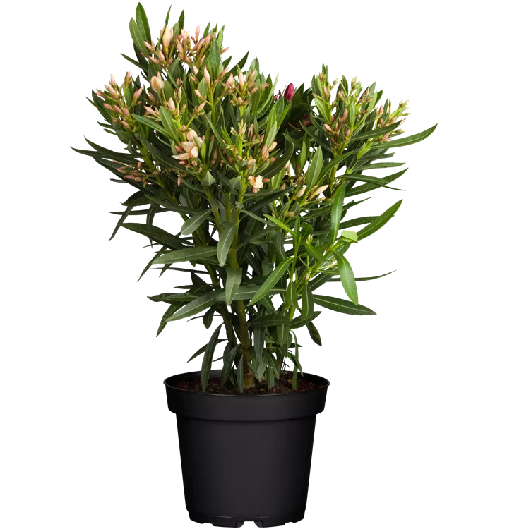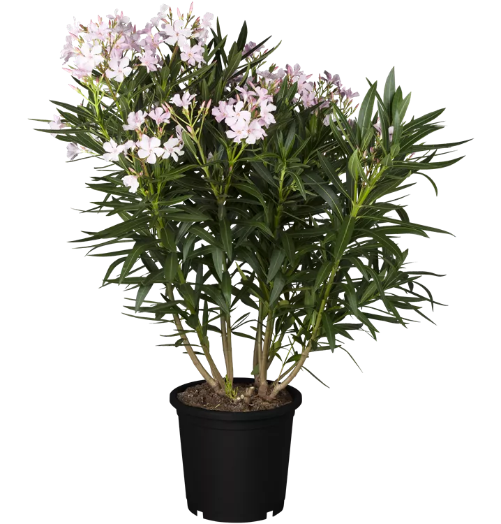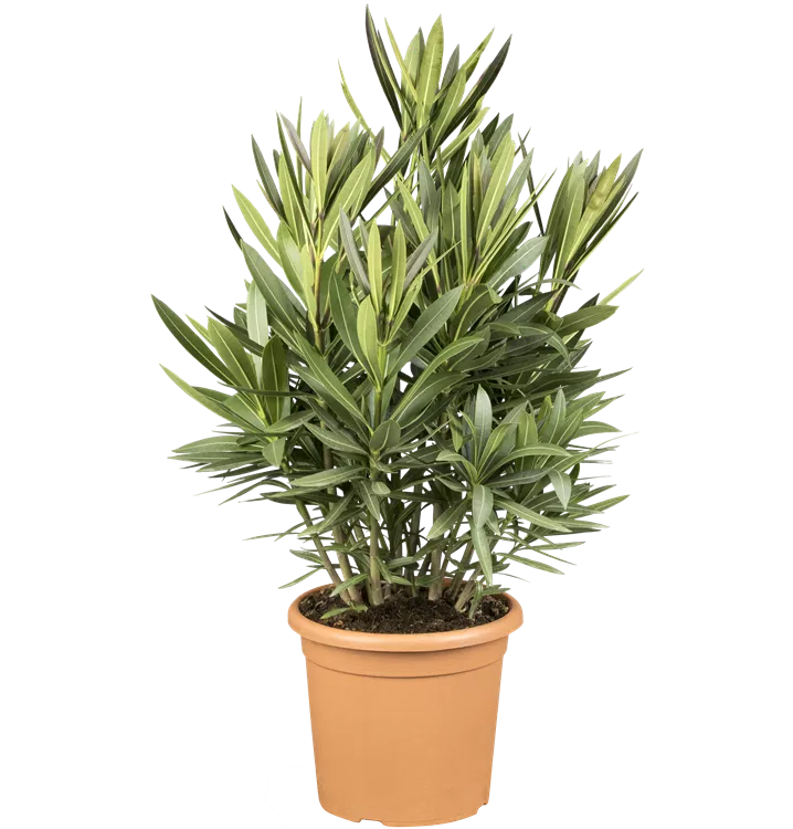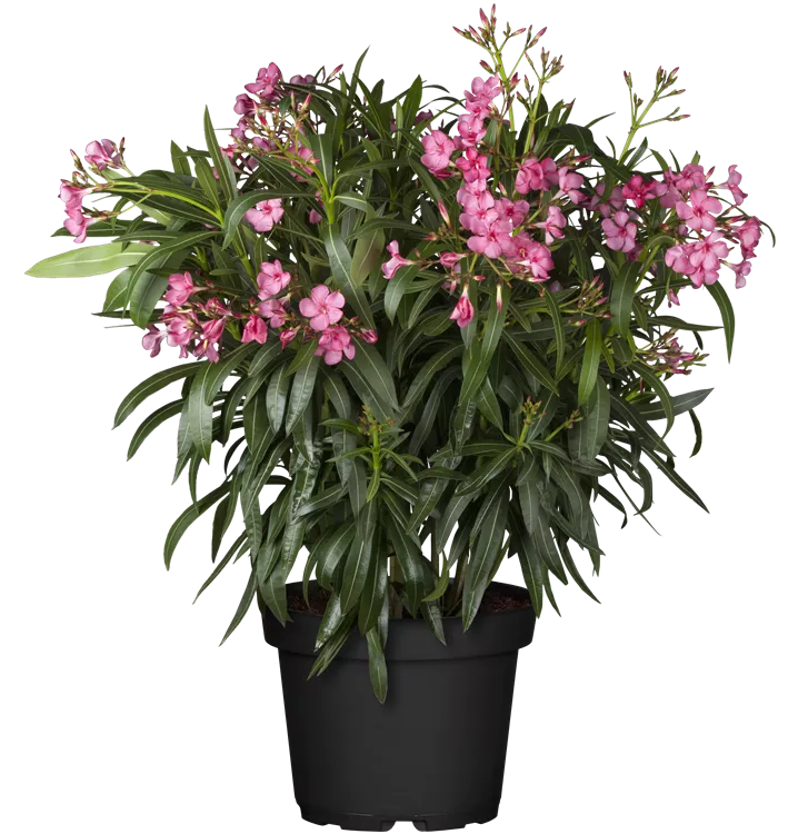 Der Oleander (Nerium oleander) ist eine sehr beliebte, immergrüne Kübelpflanze. Seine dekorativen Blüten erscheinen von Juni bis September. Die dunkelgrünen Blätter sind lanzettlich. Der Standort sollte möglichst sonnig und geschützt sein. Eine durchlässige und nährstoffreiche Erde ist dabei ideal. Bei günstigen Bedingungen erreicht der Oleander eine Höhe von ca. 2 m und wird bis zu 1,8 m breit.