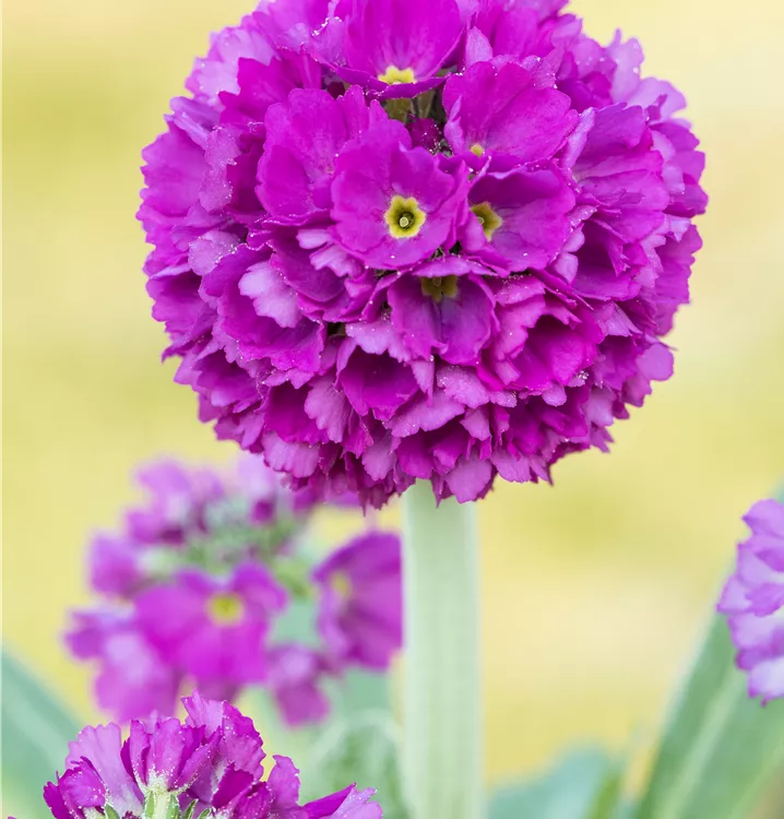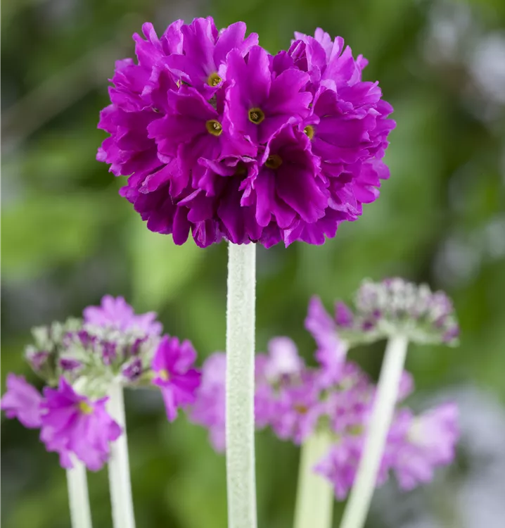 Die Kugelig blühende Schlüsselblume (Primula denticulata) ist eine aufrechte Staude, die von März bis Mai violette, ballförmige Blüten bildet. Ihre eiförmigen, Blätter sind dunkelgrün. An einem sonnigen bis halbschattigen Standort mit durchlässigem, nährstoffreichem Boden erreicht sie gewöhnlich eine Höhe von ca. 30 cm und wird ca. 20 cm breit. Die Kugelig blühende Schlüsselblume ist gut frostverträglich.