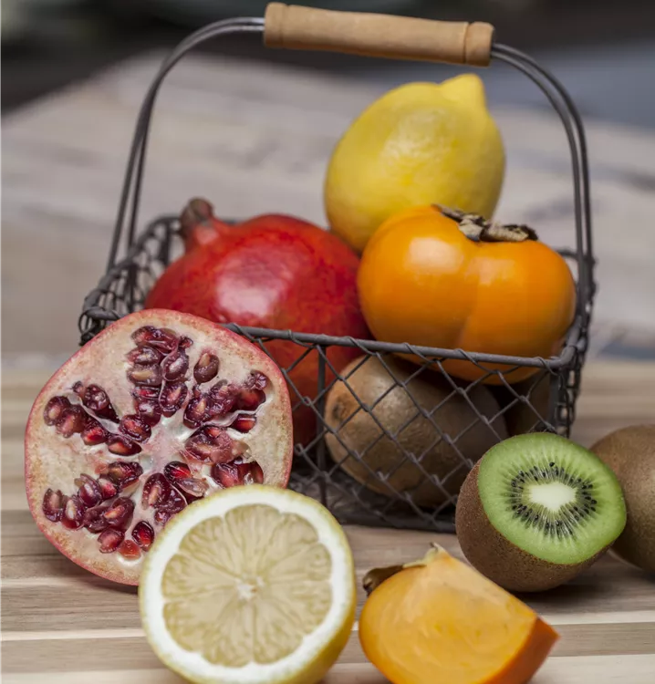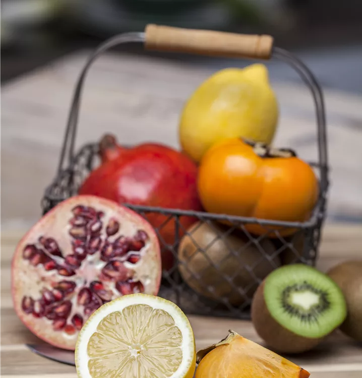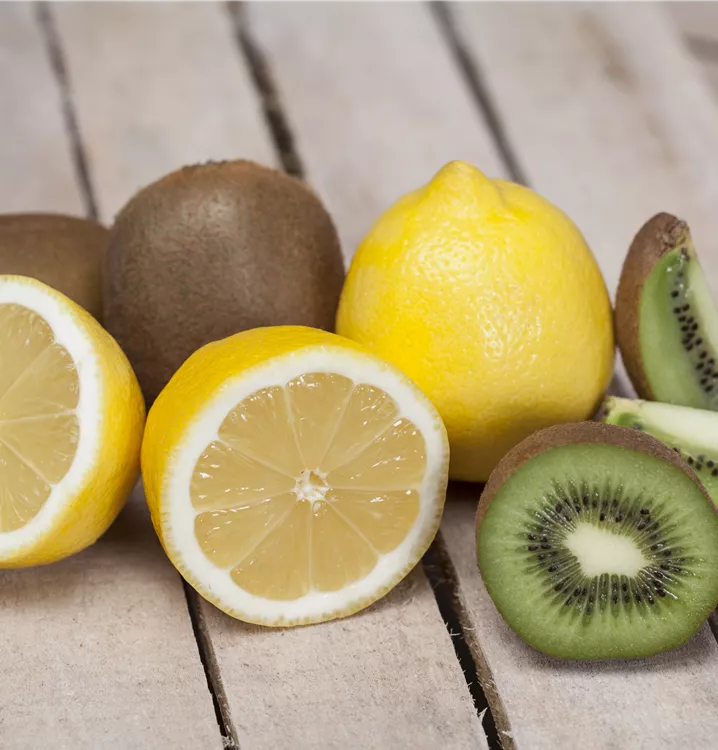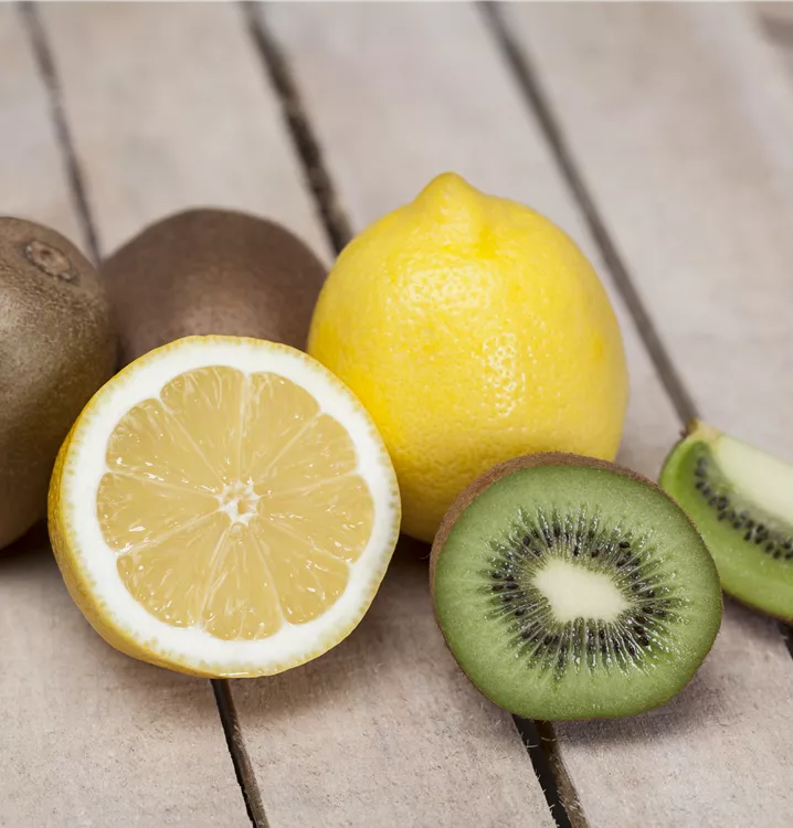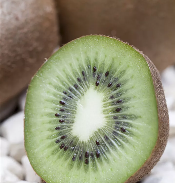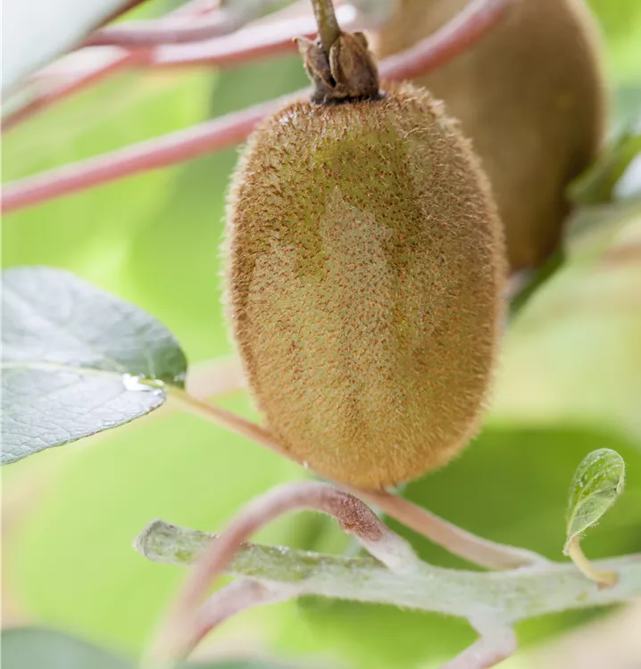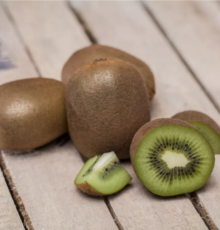 Die Kiwi (Actinidia chinensis) bildet braune Früchte. Sie sind oval und haben einen süß-säuerlichen Geschmack. Für eine ertragreiche Ernte ab September schaffen durchlässiger, humoser, kalkfreier, nährstoffreicher Boden und ein sonniger Standort optimale Bedingungen. Ihre cremeweißen Blüten sind eine schöne Erscheinung. Die Kiwi wird mit ihrem kletternden Wuchs etwa 7 m hoch und 4 m breit.