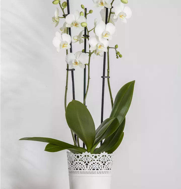 Die Schmetterlingorchidee 'Tropic Snowball' (Phalaenopsis) ist eine schöne, in weiß blühende Orchidee. Ihre lippenförmigen Blüten sind sehr dekorativ und erscheinen in Rispen von Januar bis Dezember. Mit ihrem aufrechten Wuchs wird sie bis zu 50 cm hoch und 50 cm breit. Für das optimale Wachstum sorgen ein heller Standort sowie eine möglichst durchlässige und lockere Erde.