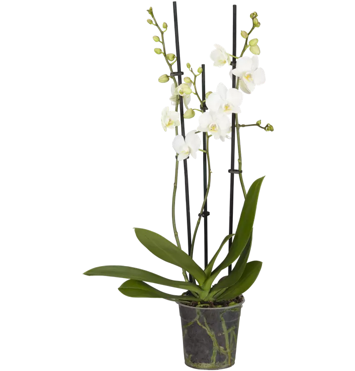 Phalaenopsis 'Tropic Snowball' bringt von Januar bis Dezember dekorative, lippenförmige, in Rispen angeordnete, weiße Blüten hervor. .