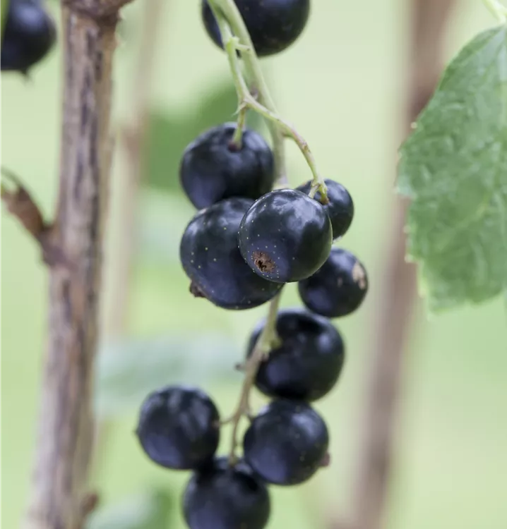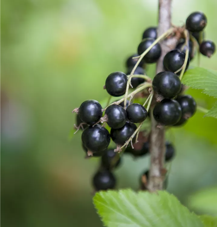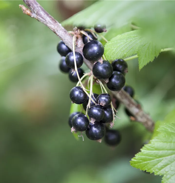 Die Schwarze Johannisbeere (Ribes nigrum) bildet schwarze Beeren. Diese sind süß-säuerlich im Geschmack. Für eine ertragreiche Ernte ab Juli schaffen durchlässiger, nährstoffreicher Boden und ein sonniger bis halbschattiger Standort optimale Bedingungen. Ihre grün-roten Blüten sind eine schöne Erscheinung.