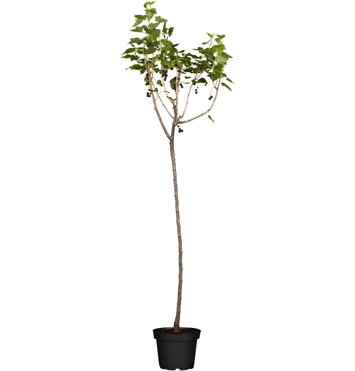 Die schwarzen Beeren haben einen süß-säuerlichen Geschmack. Reifezeit ab Juli.