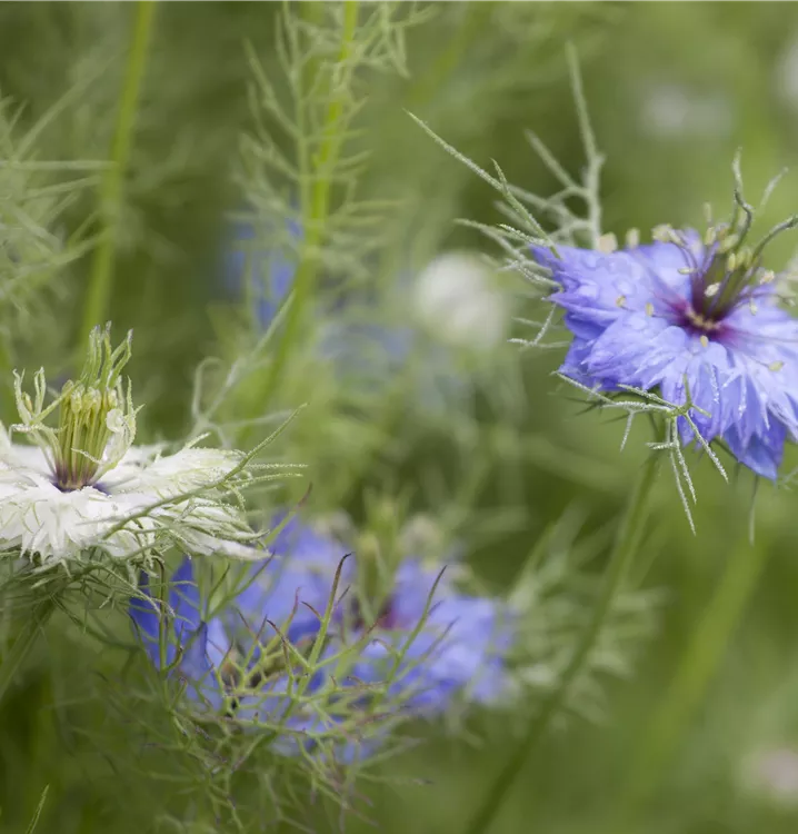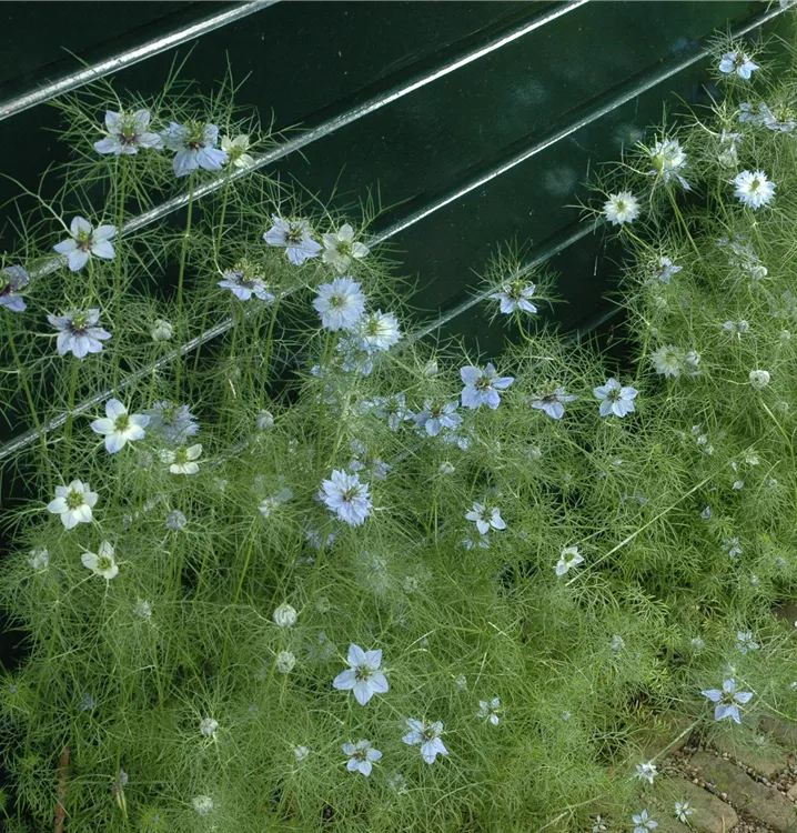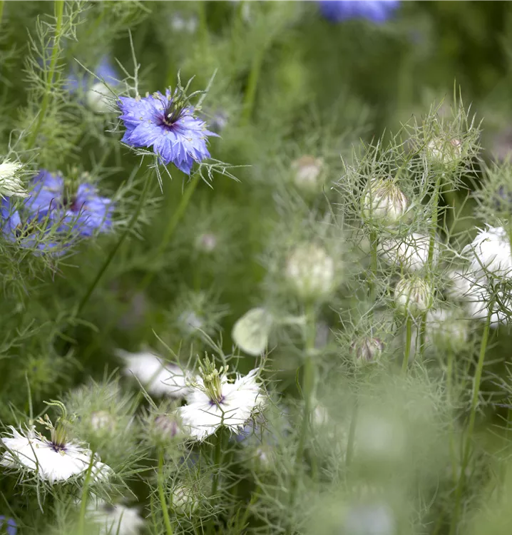 Die Jungfer im grüne (Nigella damascena) ist eine beliebte Pflanze für den Balkon, die während der gesamten Saison unzählige blaue, weiße, rosafarbene oder karminrote Blüten bildet. Die mittelgrünen Blätter sind tief geschlitzt. Ein sonniger Standort und ein durchlässiges Substrat werden bevorzugt.
