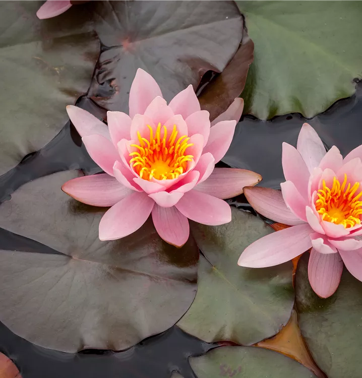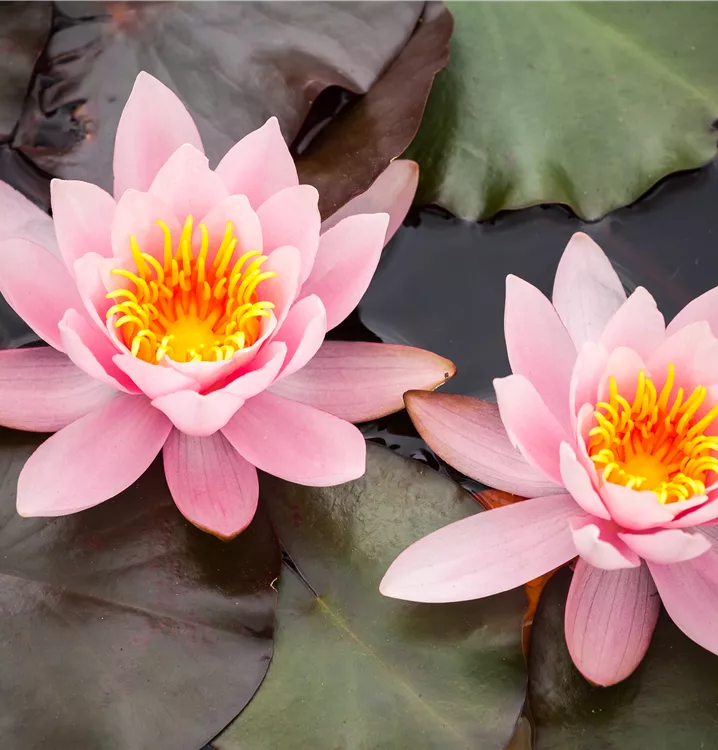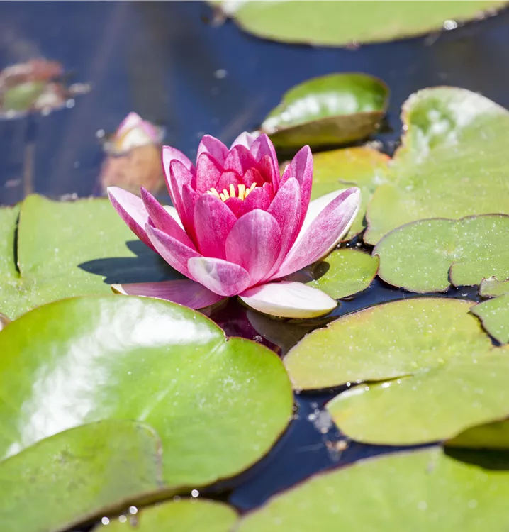 Die Seerose (Nymphaea) ist mit ihren dunkelgrünen Blättern eine ausgesprochen dekorative Wasserpflanze, die für solche Einsatzbereiche wie Teich besonders gut geeignet ist. Gelbe, rote, weiße Blüten erscheinen von Juni bis September. Sie bevorzugt humosen, nährstoffreichen Boden in sonniger Lage. Die Seerose ist gut frostverträglich. Die flache Pflanze erreicht gewöhnlich eine Höhe von ca. 10 cm.