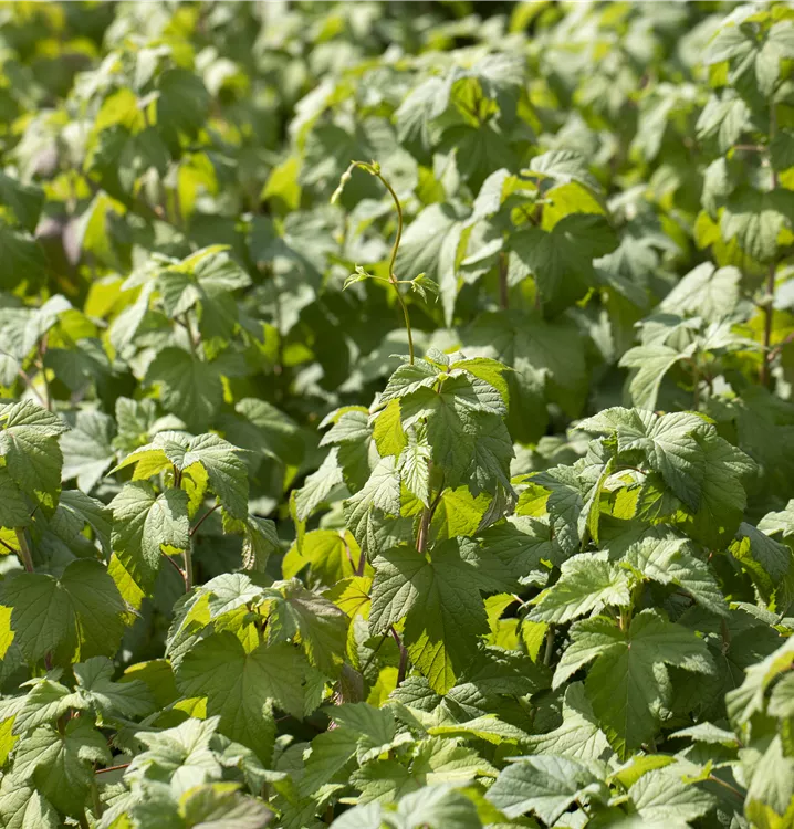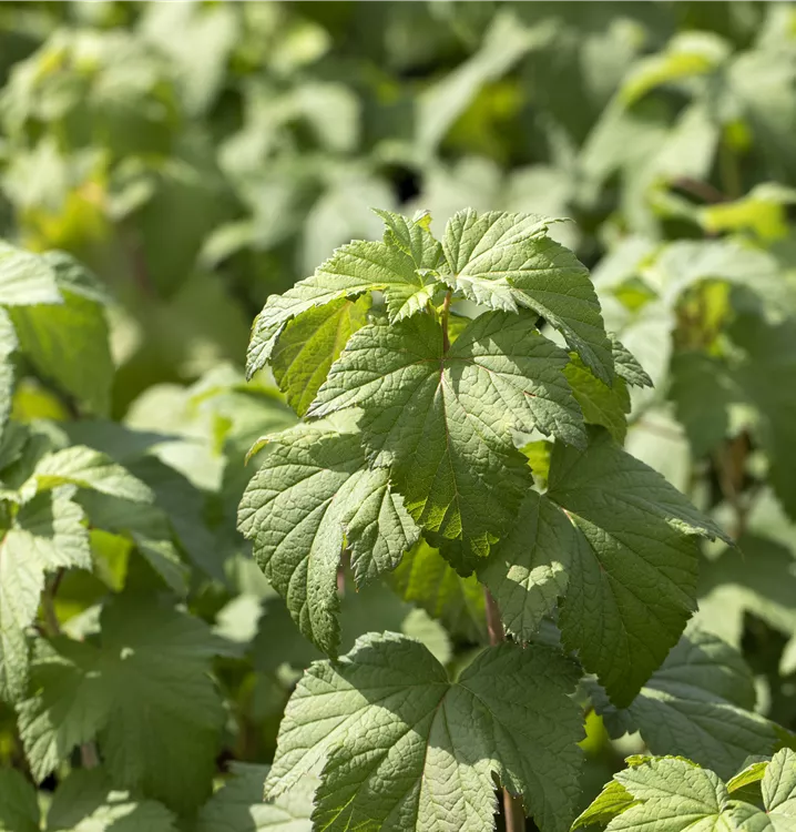 Die sommergrünen Blätter der Blutjohannisbeere sind mittelgrün. Blutjohannisbeere zeigt sich leuchtend gelb im Herbst.