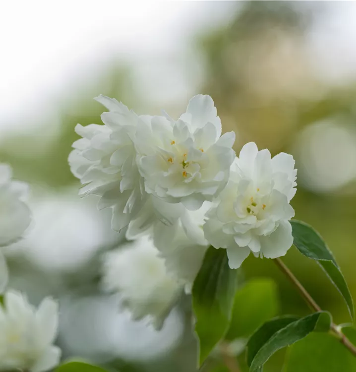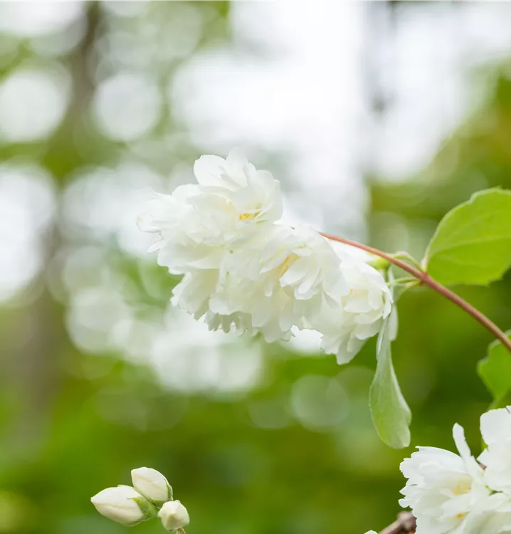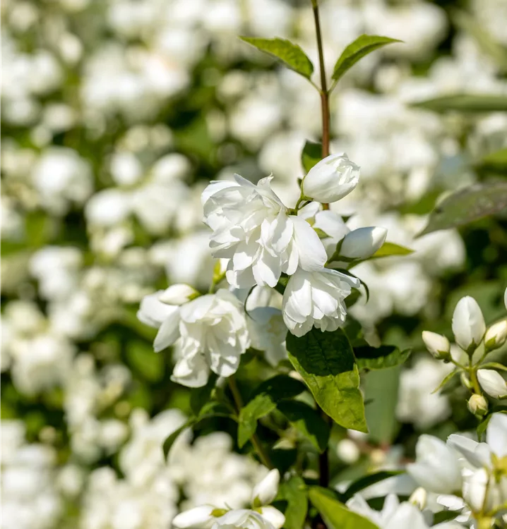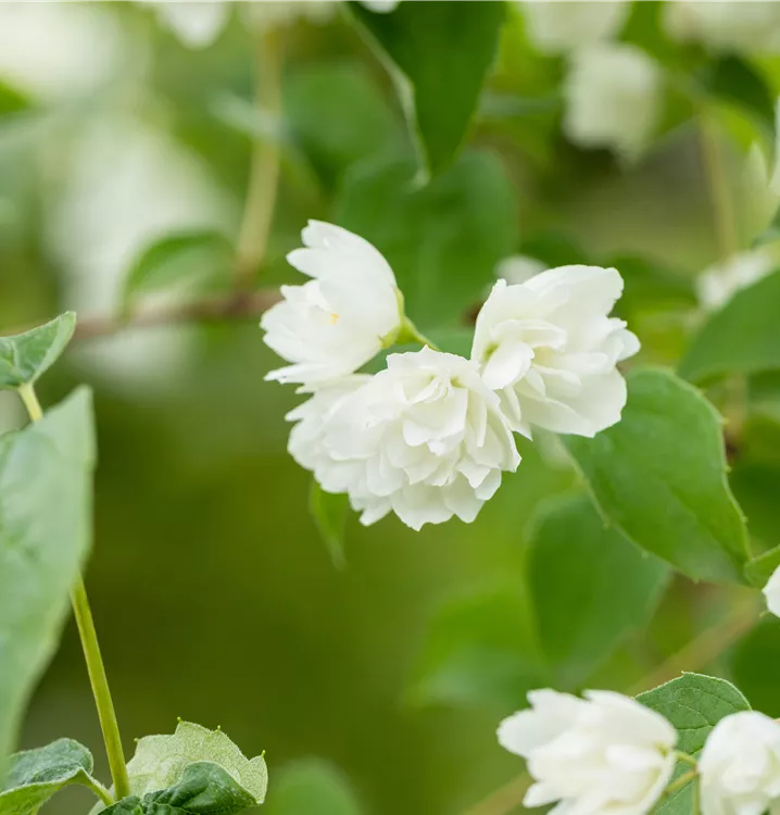 Die weißen, starkgefüllten, schalenförmigen Blüten des Gartenjasmin 'Schneesturm' erscheinen in Trauben von Juni bis Juli. Diese werden etwa 4 - 5 cm groß und sind stark duftend.