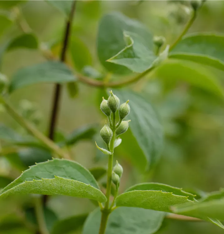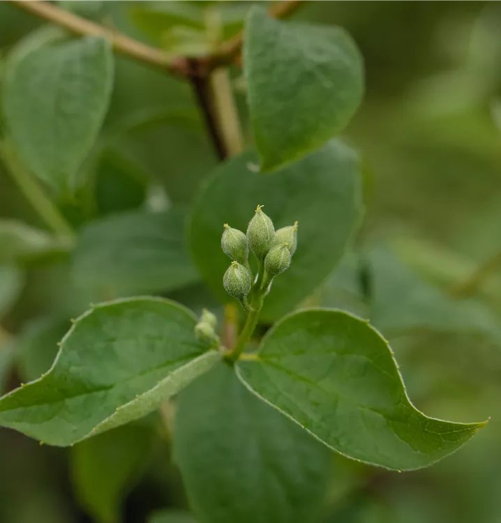 Die sommergrünen Blätter des Gartenjasmins 'Schneesturm' sind dunkelgrün, eiförmig, gegenständig. Diese sind etwa 3 - 5 cm groß.