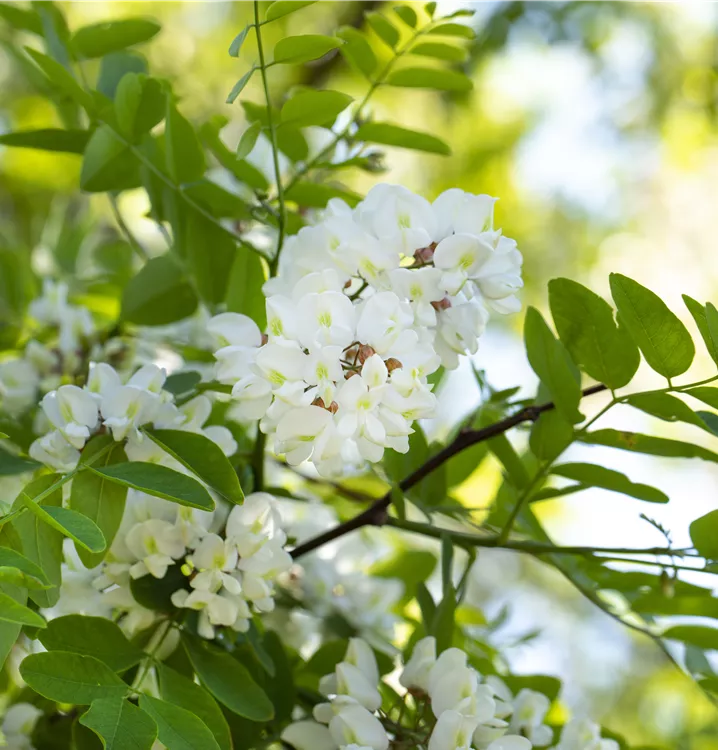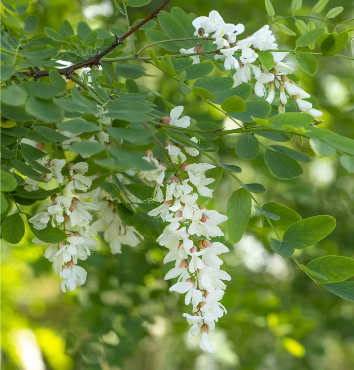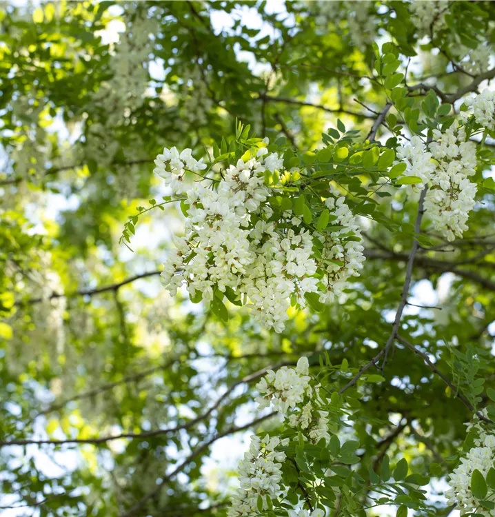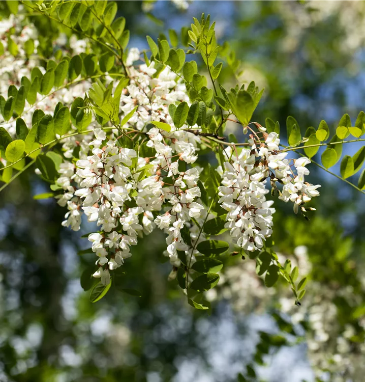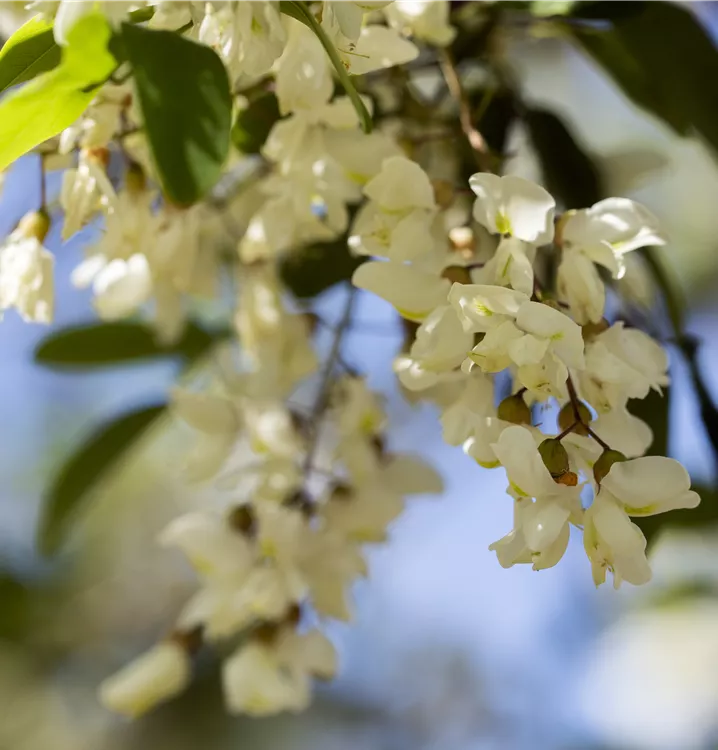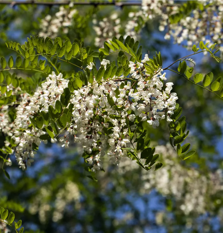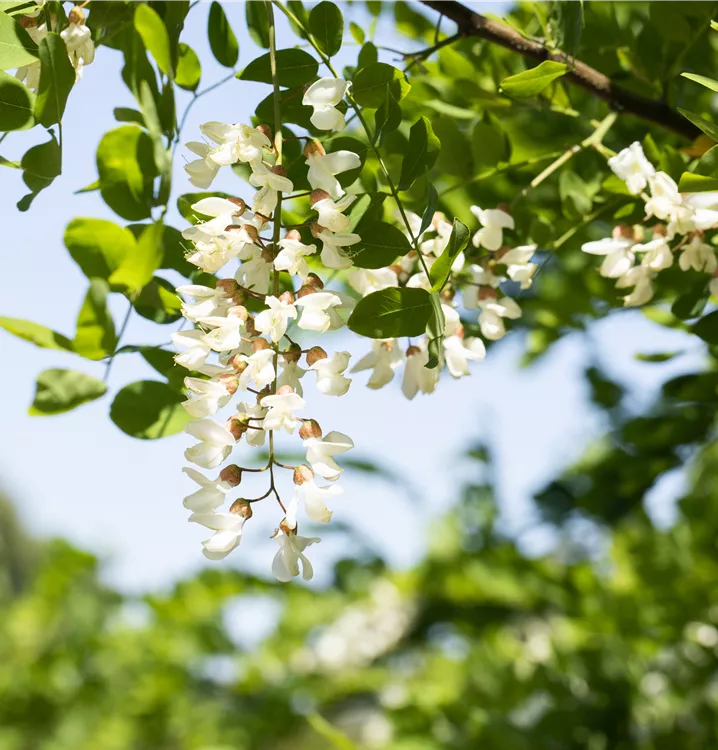 Die weißen Blüten der Scheinakazie erscheinen in Trauben von Ende Mai bis Anfang Juni. Diese sind stark duftend.