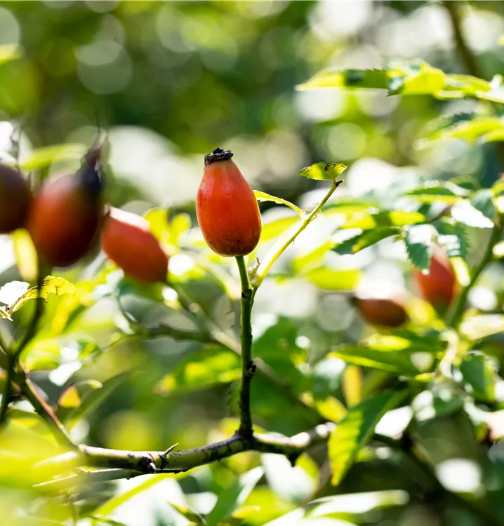 Besonders dekorativ sind die scharlachroten, länglichen Früchte von Rosa canina. Diese erscheinen ab September.