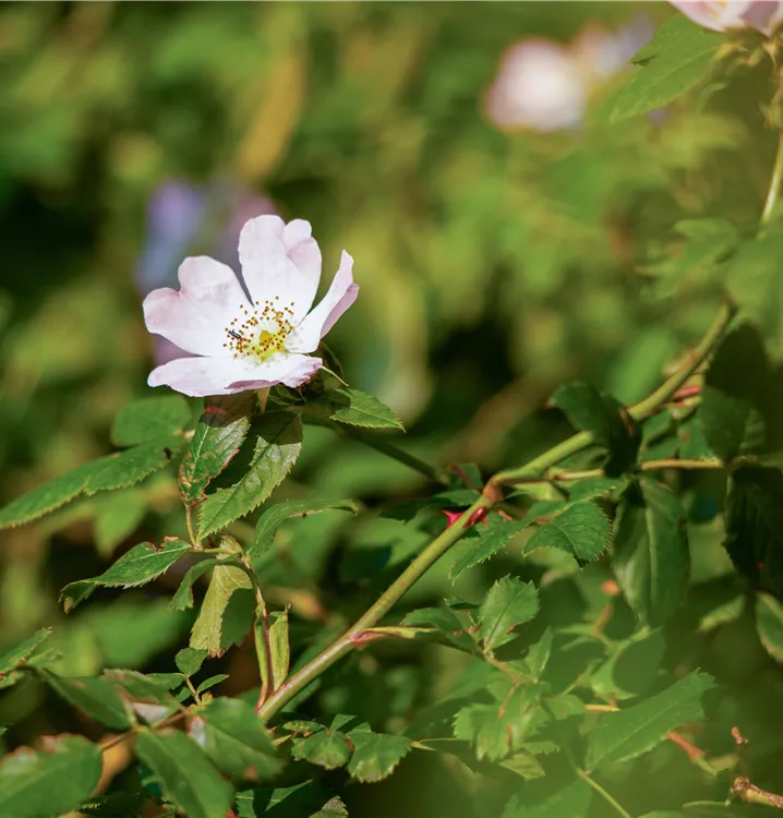 Die Hundsrose (Rosa) ist eine reichblühende Rose, die im Garten eine besondere Rolle spielt. Die zahlreichen Blüten sind rosa oder weiß und erscheinen von Ende Mai bis Juli. Ihr wunderbarer Duft entfaltet sich besonders an sonnigen, warmen Tagen. Zudem haben ihre länglichen, scharlachroten Früchte einen besonderen Zierwert, wenn sie ab September reif sind. Mit dem buschigen und ausladenden Wuchs wird dieser Strauch bis zu 3 m hoch und 3 m breit.