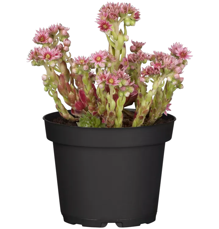 Die rosafarbenen, körbchenartigen Blüten der Dach-Hauswurz erscheinen in Rispen von Juni bis Juli.
