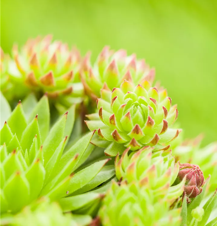Die Dach-Hauswurz (Sempervivum tectorum) zählt zu den pflegeleichten Pflanzen und besitzt mittelgrüne, dickfleischige, lanzettliche Blätter. Ihre körbchenartigen Blüten erscheinen in Rispen im Zeitraum von Juni bis Juli. Diese polsterbildende, rosettenartige und ausläuferbildende Pflanze gedeiht am besten an einem sonnigen Standort.