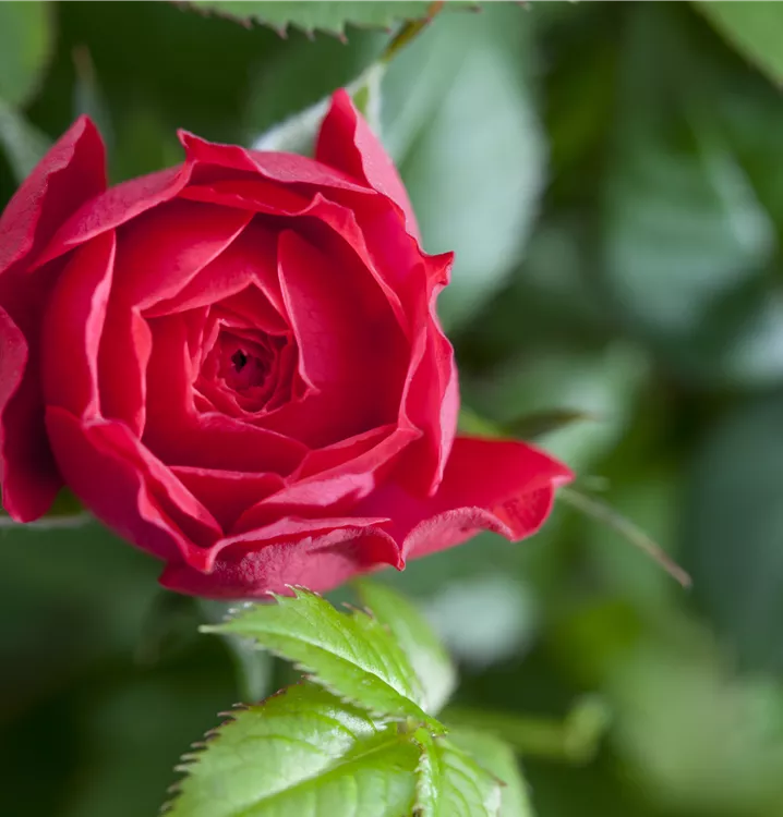 Die immergrünen Blätter der Minirose Kordana® sind dunkelgrün, eiförmig, lanzettlich, gefiedert, wechselständig, gezähnt.