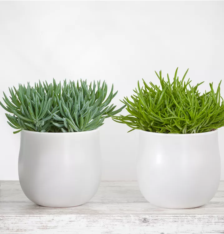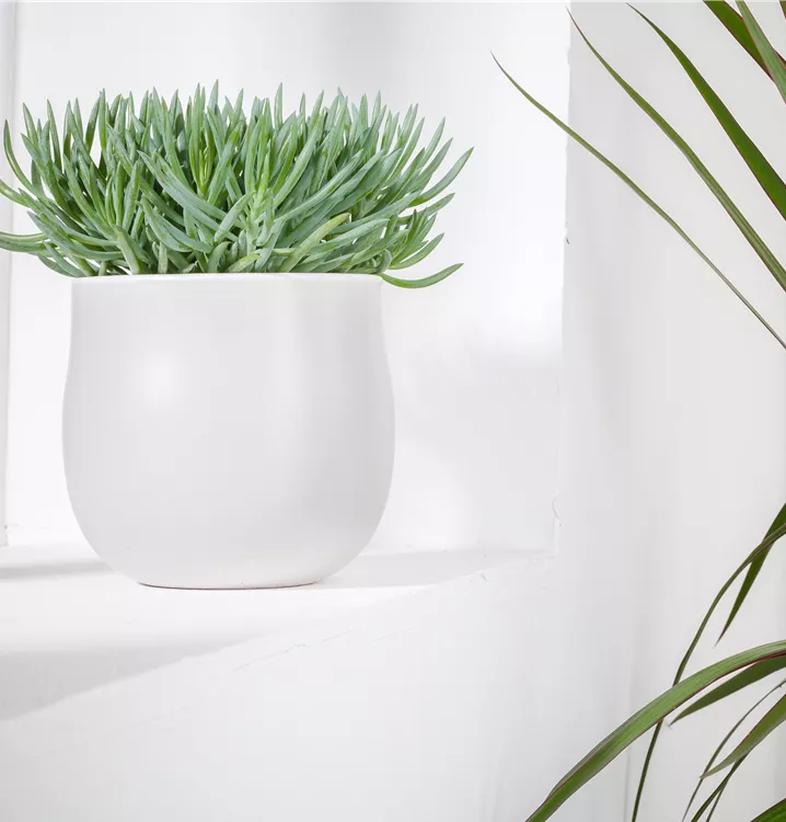 Das Greiskraut (Senecio barbertonicus) trägt grau-grüne Blätter. Diese strauchartige, sukkulente und kompakte Pflanze gedeiht am besten an einem hellen Standort.
