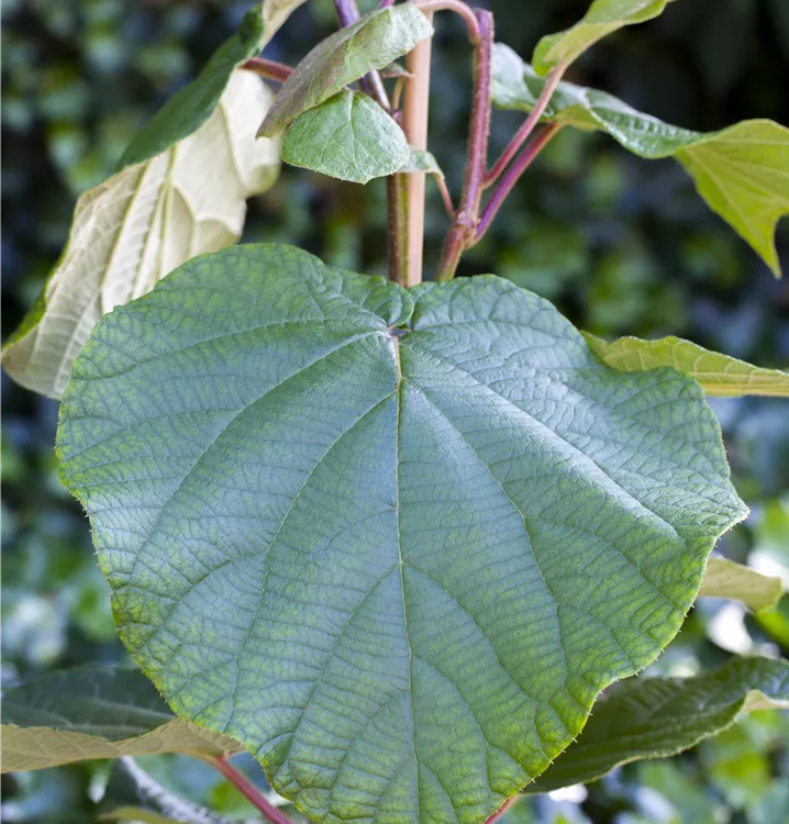 Die sommergrünen Blätter der Kiwi 'Atlas' (männlich) sind dunkelgrün, herzförmig. Diese sind etwa 10 - 15 cm groß.