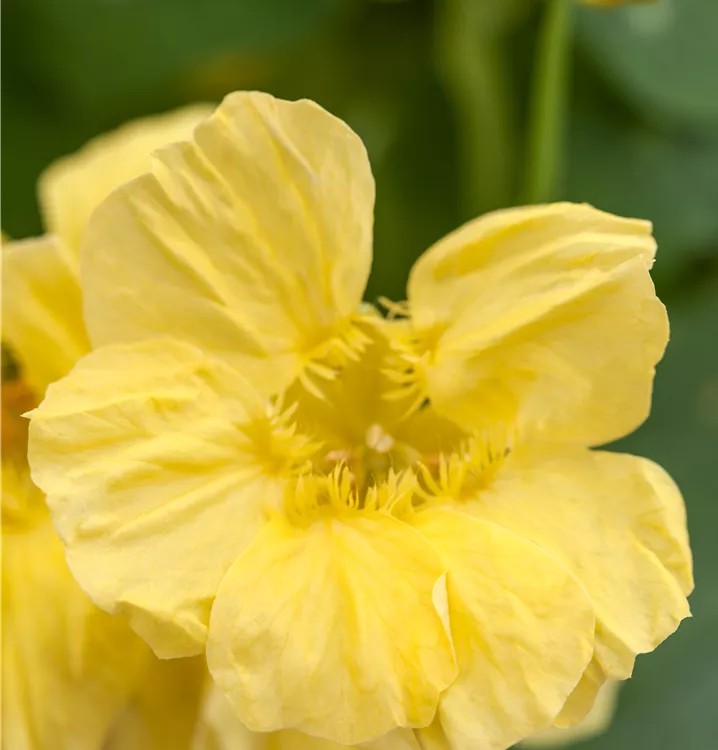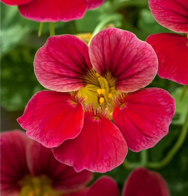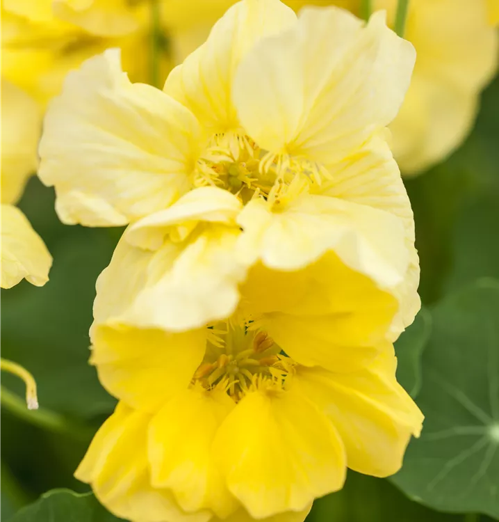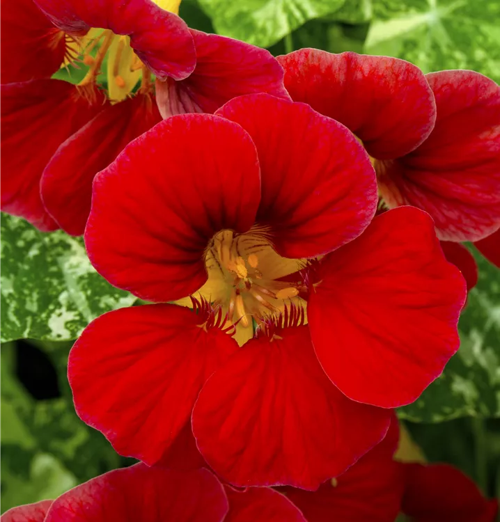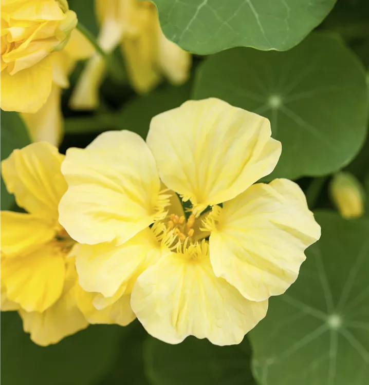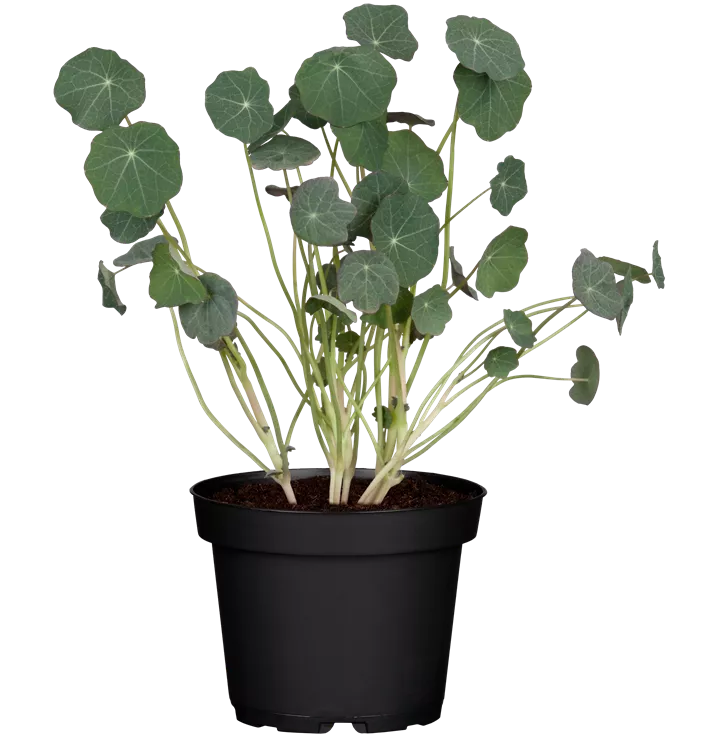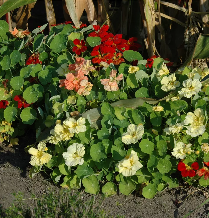 Die Große Kapuzinerkresse (Tropaeolum majus) ist eine beliebte Pflanze für den Balkon, die während der gesamten Saison unzählige gelbe, orangefarbene oder rote Blüten bildet. Die dunkelgrünen Blätter sind rundlich. Ein sonniger bis halbschattiger Standort und ein durchlässiges Substrat werden bevorzugt. Mit ihrem kriechenden bzw. kletternden Wuchs passt die Große Kapuzinerkresse besonders gut in Blumenampeln und hängende Pflanzkörbe.
