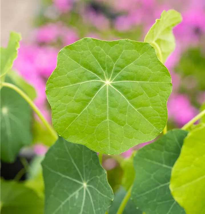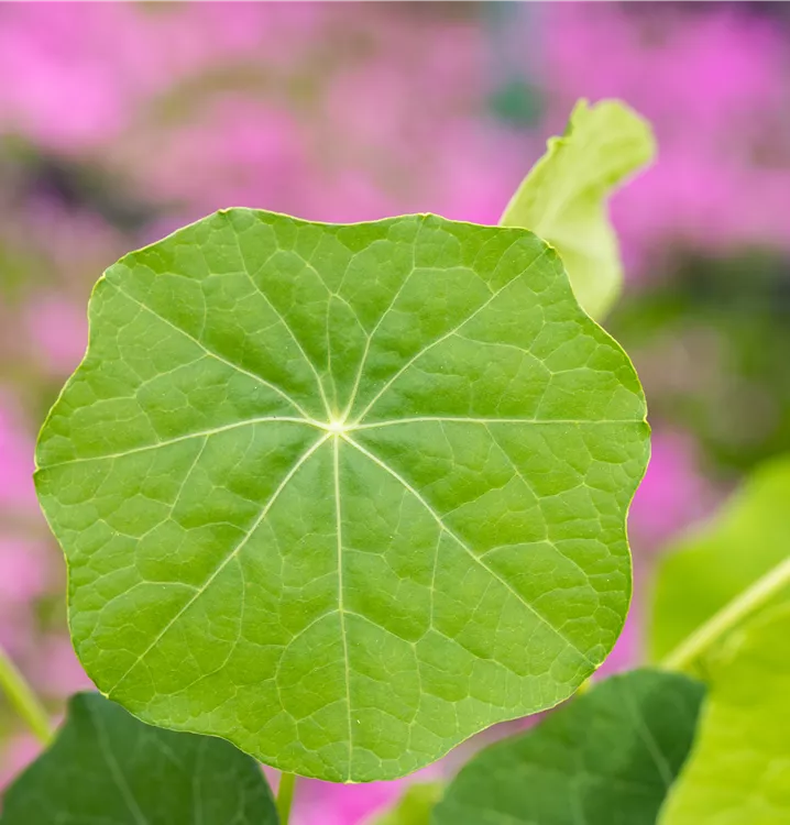 Zum Verzehr geeignet. Die Blätter der Große Kapuzinerkresse sind dunkelgrün, rundlich.