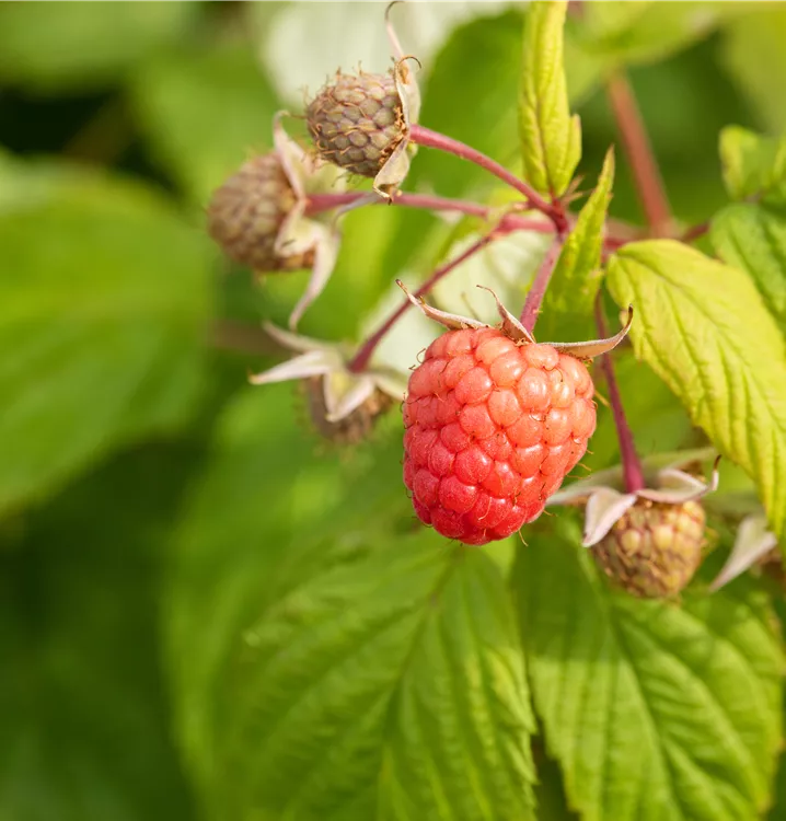 Die Himbeere 'Autumn Bliss'(s) (Rubus idaeus) bildet rosarote, große Beeren. Diese sind süß-säuerlich im Geschmack. Für eine ertragreiche Ernte ab August schaffen durchlässiger, nährstoffreicher Boden und ein sonniger bis halbschattiger Standort optimale Bedingungen. Ihre weißen Blüten sind eine schöne Erscheinung.