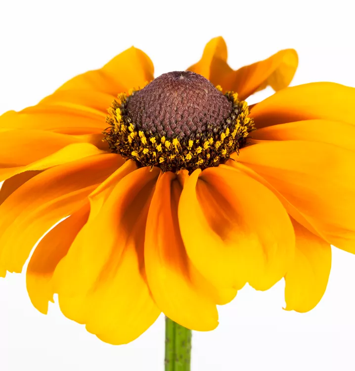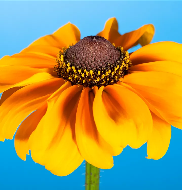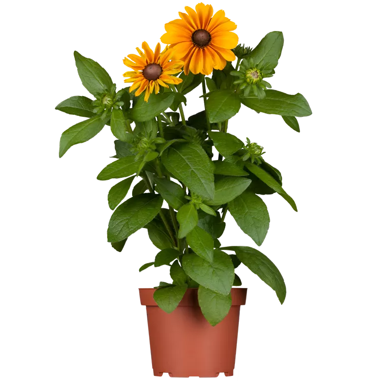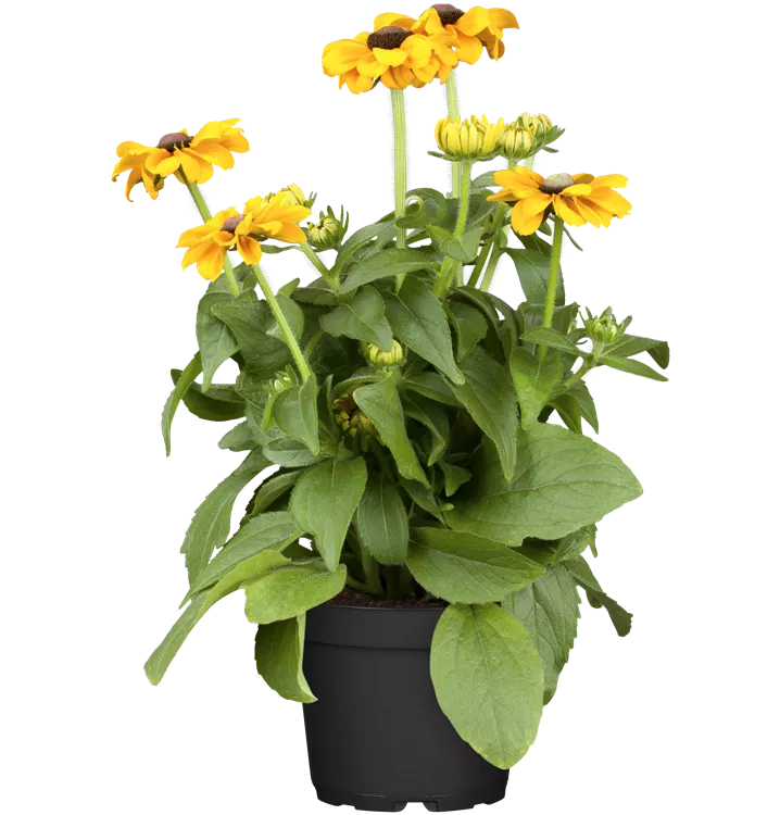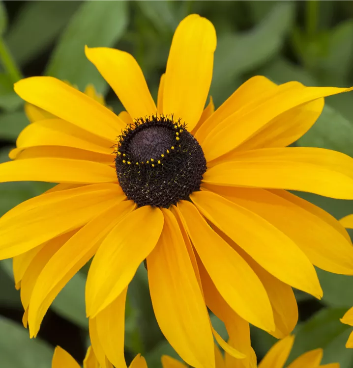 Rudbeckia hirta bildet radförmige, in Trauben angeordnete, orangegelbe Blüten ab Mai.