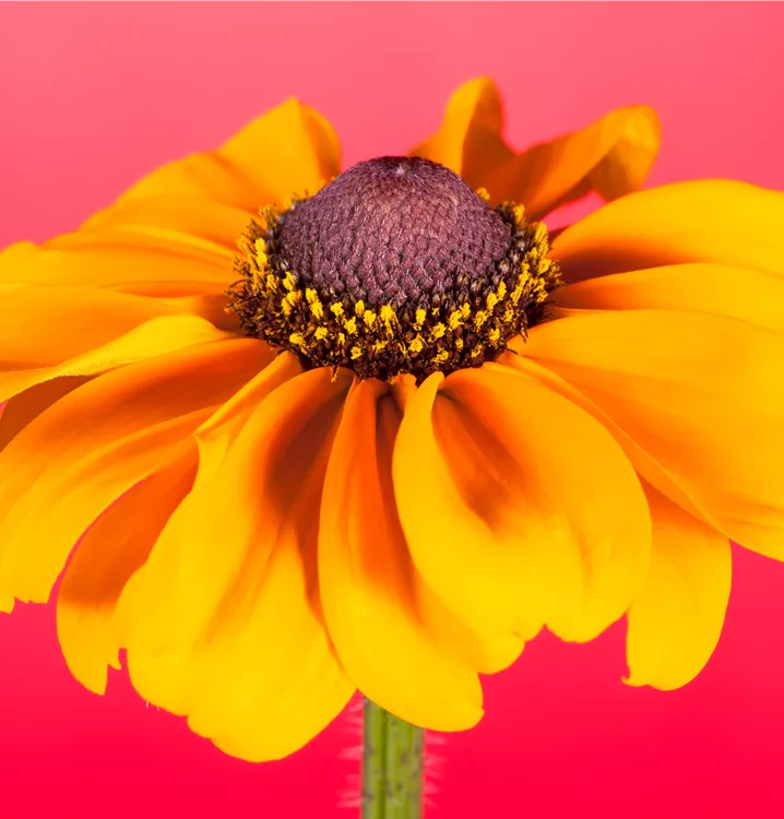 Der Raue Garten-Sonnenhut (Rudbeckia hirta) ist eine buschige, rhizombildende Staude, die von Mai bis September orangegelbe, radförmige, in Trauben angeordnete Blüten bildet. An einem sonnigen bis halbschattigen Standort mit durchlässigem, nährstoffreichem Boden erreicht er gewöhnlich eine Höhe von ca. 1 m und wird ca. 60 cm breit. Der Raue Garten-Sonnenhut ist gut frostverträglich.