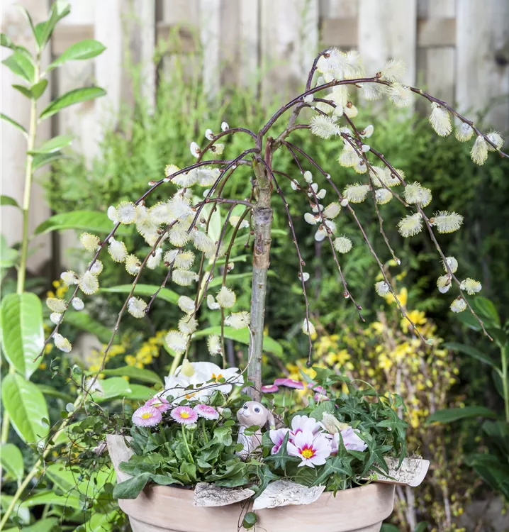 Die Hängende Kätzchenweide 'Pendula' (Salix caprea) ist ein überhängender Kleinbaum, der silbrige, in Kätzchen angeordnete Blüten mit einem leichten Duft hervorbringt. Sie erscheinen von März bis April. An einem sonnigen bis halbschattigen Standort mit durchlässigem, feuchtem bis nassem Boden erreicht sie gewöhnlich eine Höhe von ca. 1,5 m und wird ca. 1 m breit.