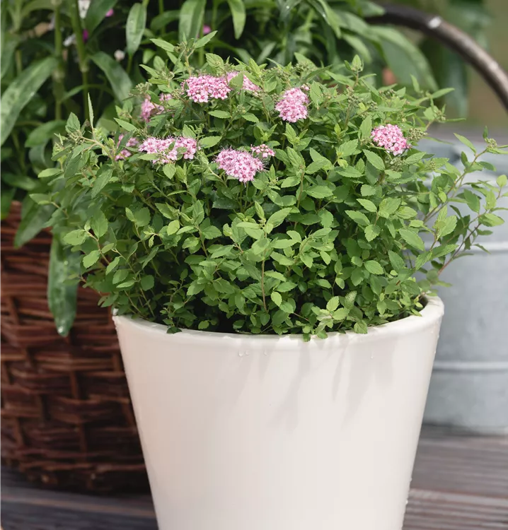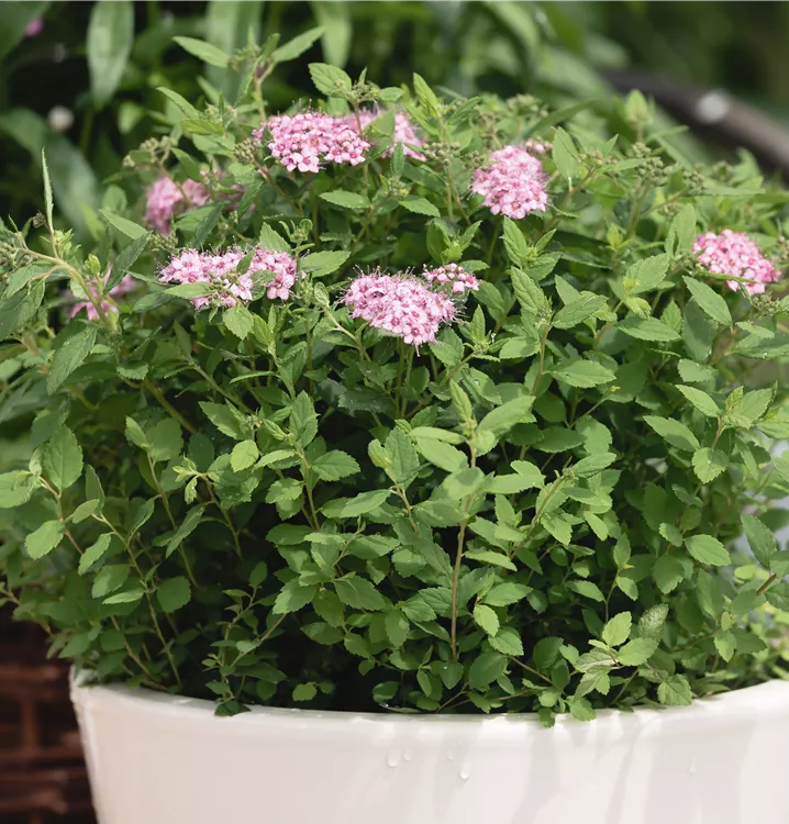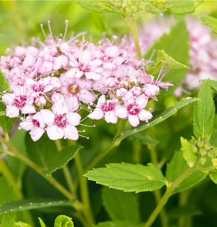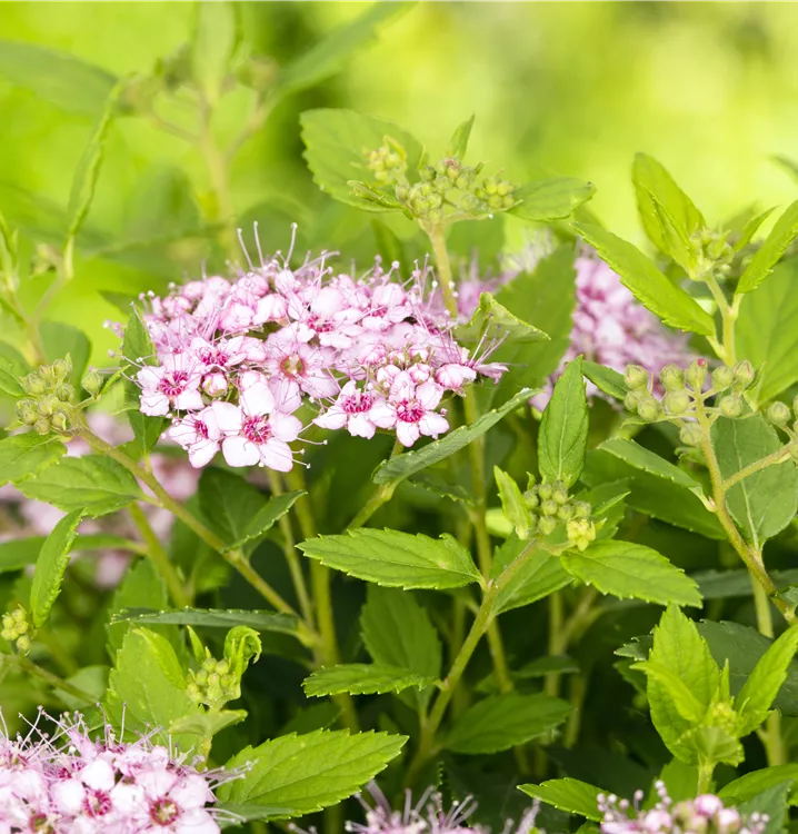 Die Sommerspiere (Spiraea japonica) ist ein kompakter Kleinstrauch, der hellrosafarbene Blüten hervorbringt. Sie erscheinen von Juni bis Juli. An einem sonnigen bis halbschattigen Standort mit durchlässigem, nährstoffreichem Boden erreicht sie gewöhnlich eine Höhe von ca. 60 cm und wird ca. 1 m breit.