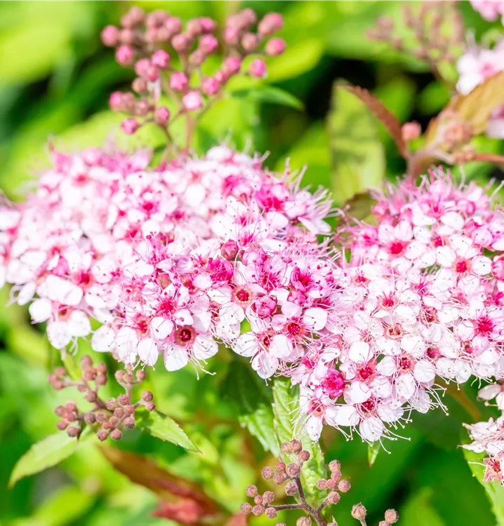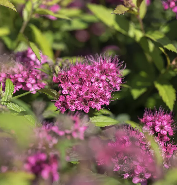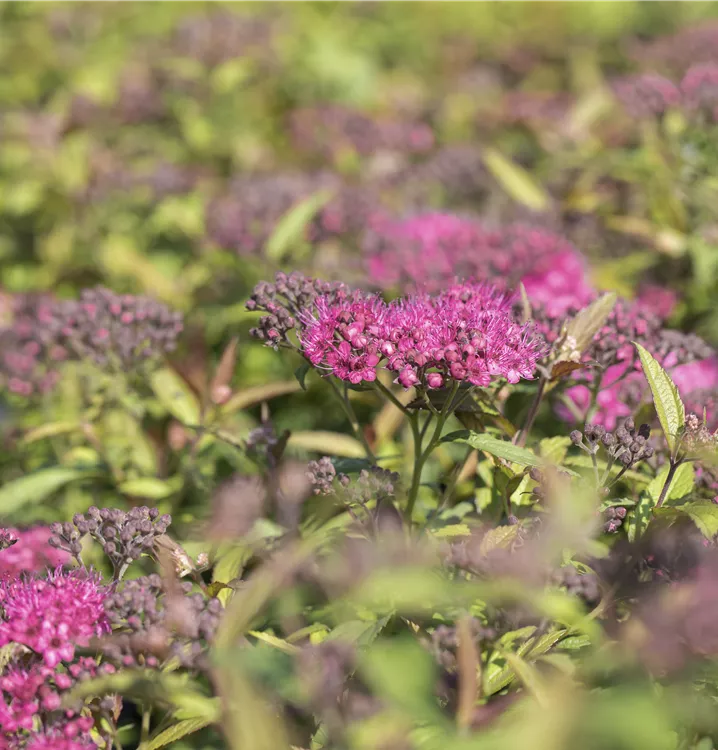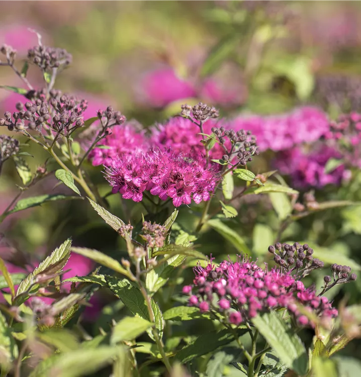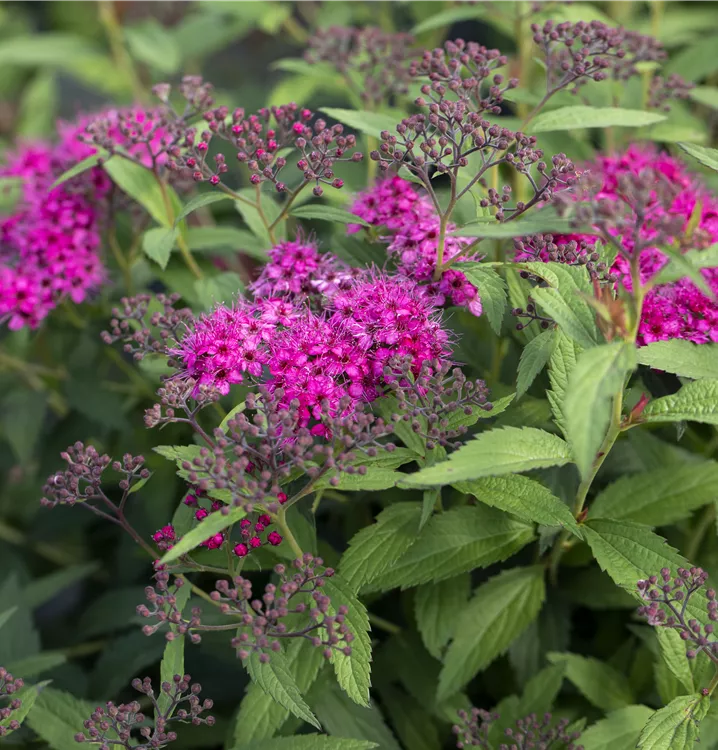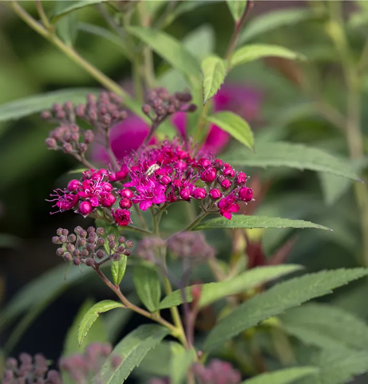 Die magentafarbenen Blüten der Sommerspiere 'Anthony Waterer' erscheinen in Trugdolden von Juli bis September. Diese werden etwa 15 - 20 cm groß.