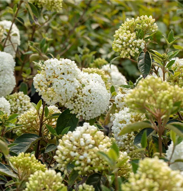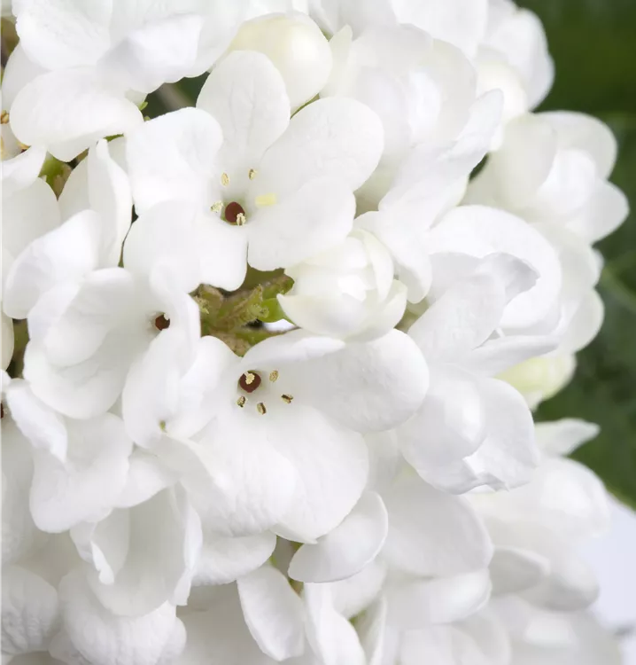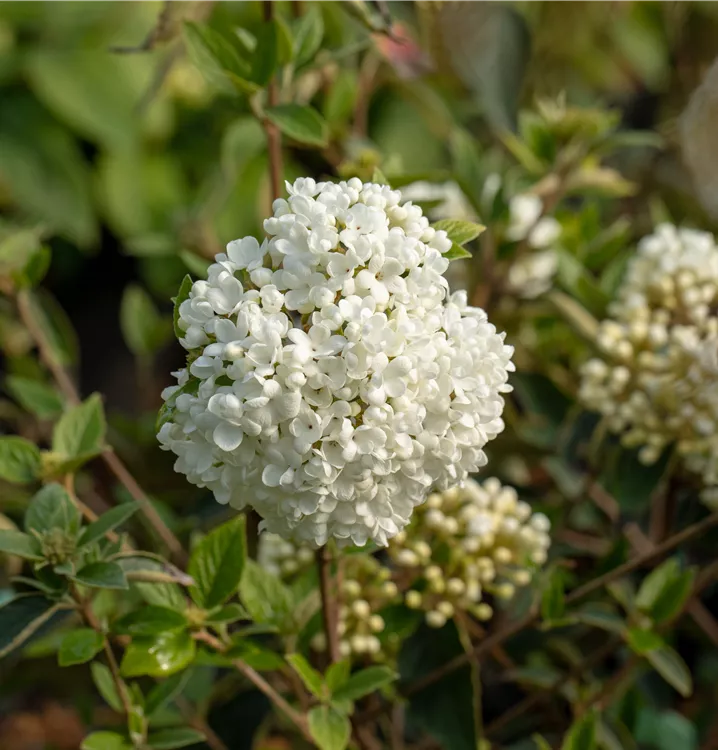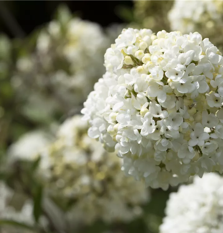Die cremeweißen Blüten des Schneeball 'Eskimo' erscheinen in Trugdolden von April bis Mai. Diese sind stark duftend. Bei richtiger Pflege Nachblüte im Oktober.