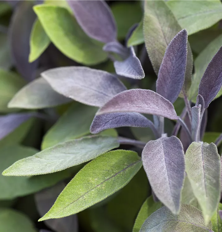 Zum Verzehr geeignet. Hoher Blattschmuckwert. Die wintergrünen Blätter des Garten-Salbeis 'Purpurea' sind violett, lanzettlich, behaart.
