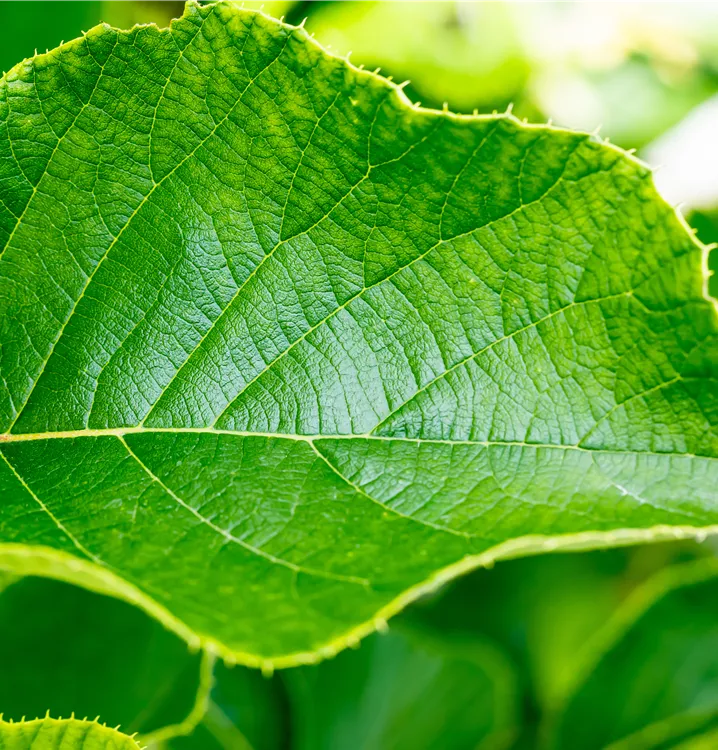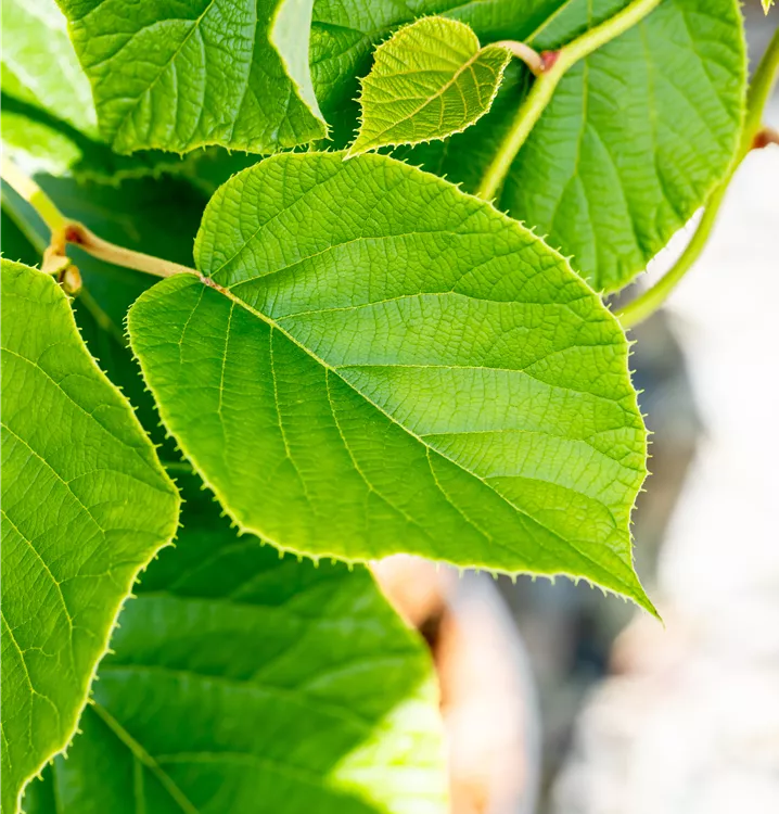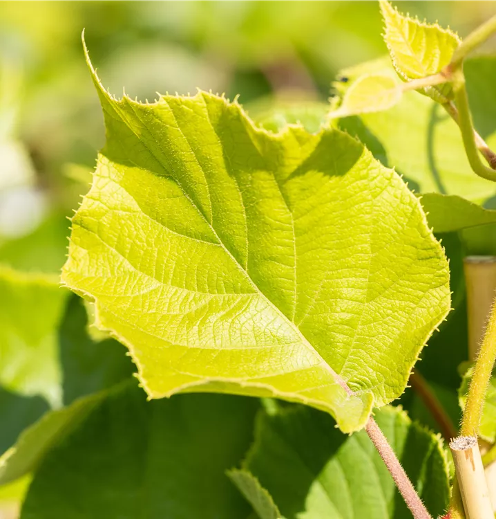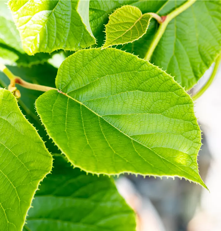 Die sommergrünen Blätter der Kiwi 'Jenny' sind dunkelgrün, rundlich, wechselständig. Diese sind etwa 10 - 15 cm groß.
