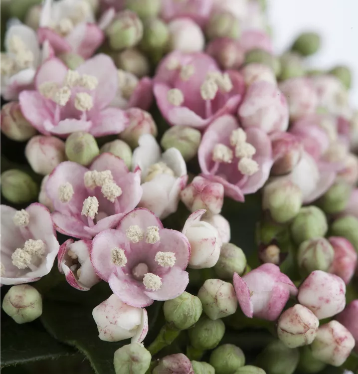 Die hellrosafarbenen Blüten des Lorbeer-Schneeball 'Eve Price' erscheinen in Schirmtrauben von Februar bis April. Diese sind leicht duftend. Bei richtiger Pflege Nachblüte im November.