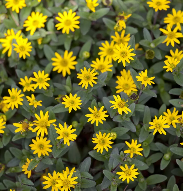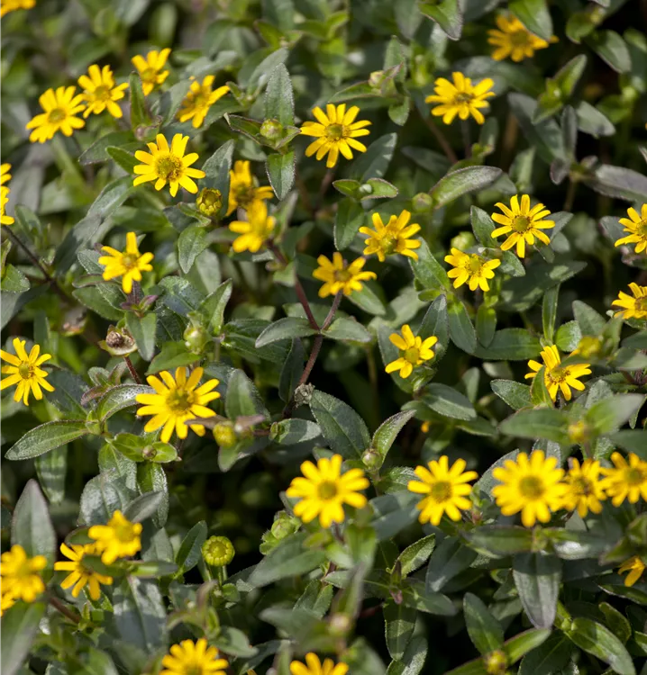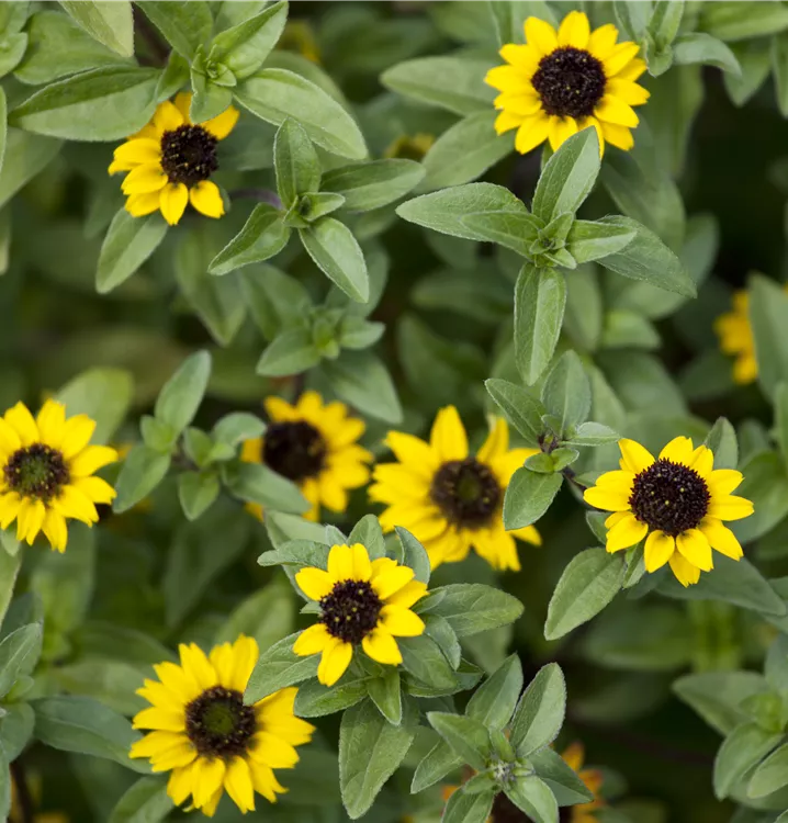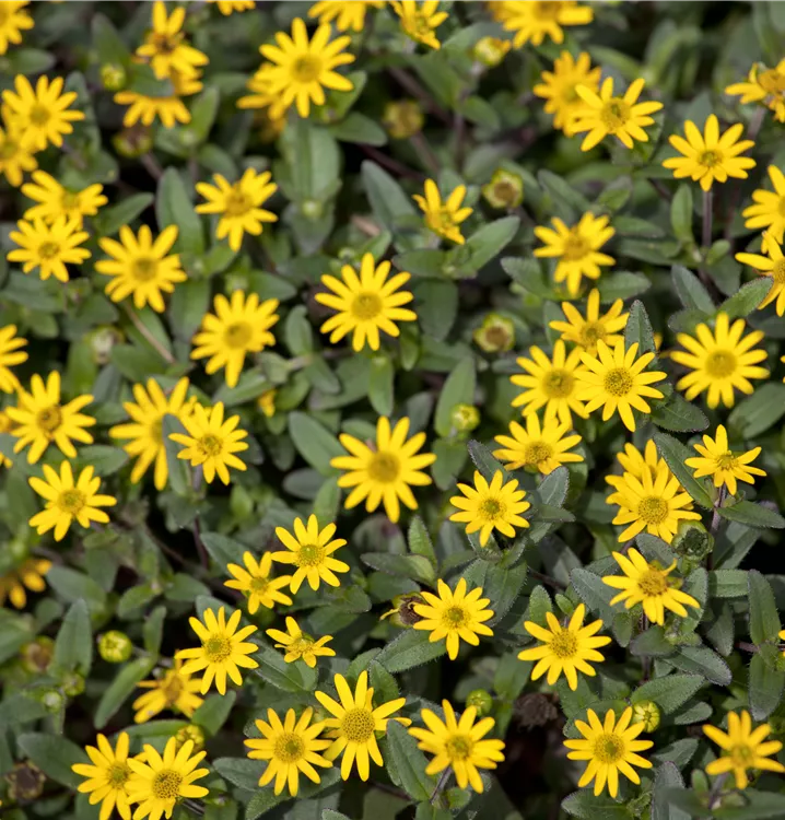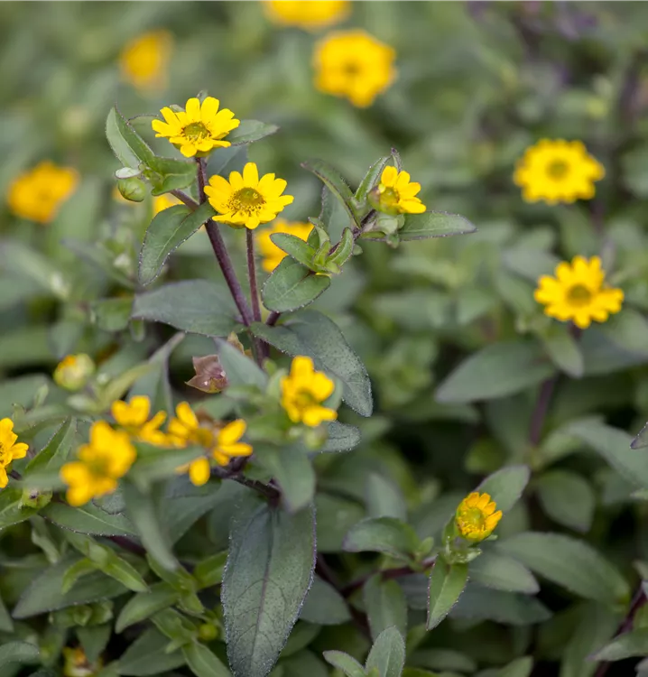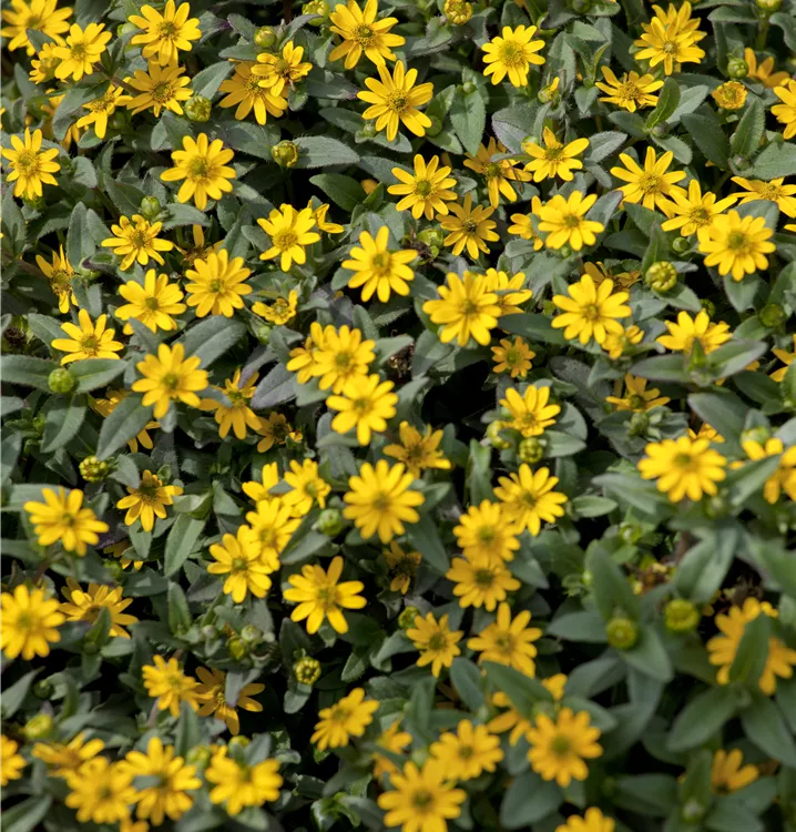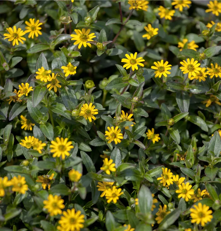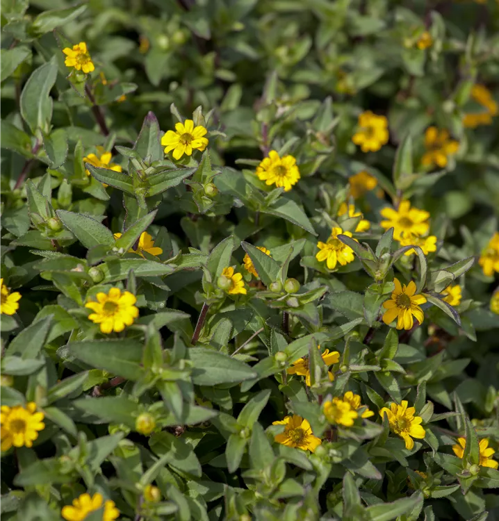 Der Husarenknopf (Sanvitalia procumbens) ist eine beliebte Pflanze für den Balkon, die während der gesamten Saison unzählige gelbe Blüten bildet. Die dunkelgrünen Blätter sind lanzettlich. Ein sonniger Standort und ein durchlässiges Substrat werden bevorzugt. Mit seinem buschigen und halbhängenden Wuchs passt der Husarenknopf besonders gut in Blumenampeln und hängende Pflanzkörbe.
