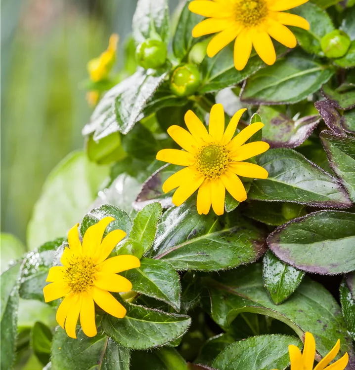 Die gelben, radförmigen Blüten erscheinen von Juli bis Oktober.