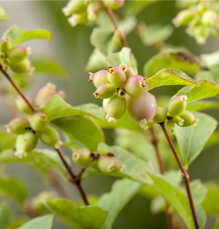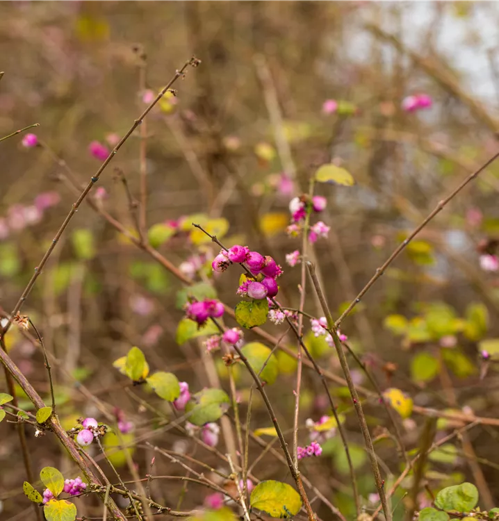 Besonders dekorativ sind die purpurroten, ovalen Beeren von Symphoricarpos x doorenbosii. Diese erscheinen ab Juli. Haften sehr lange.