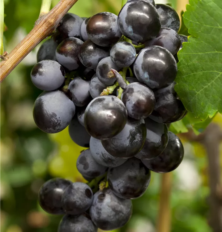 Die Weintraube (Vitis vinifera) bildet blauviolette, grüngelbe Früchte. Sie sind oval und haben einen süß-säuerlichen Geschmack. Für eine ertragreiche Ernte ab August schaffen durchlässiger, nährstoffreicher, sandiger Boden und ein sonniger bis halbschattiger Standort optimale Bedingungen. Ihre gelb-grünen, leicht duftenden Blüten sind eine schöne Erscheinung. Die Weintraube wird mit ihrem kletternden Wuchs etwa 10 m hoch und 10 m breit.