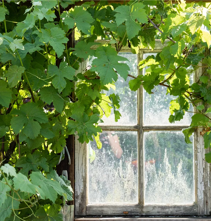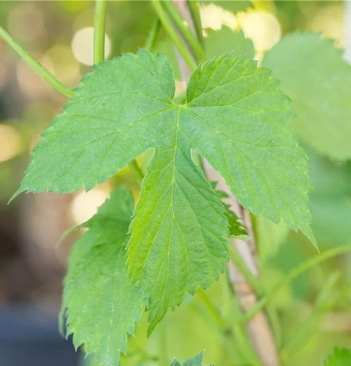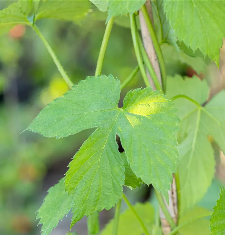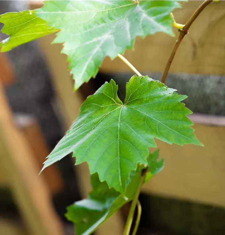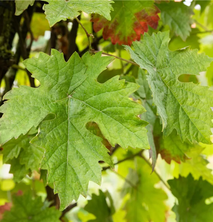 Die sommergrünen Blätter der Weintraube sind dunkelgrün, herzförmig, gezähnt. Weintraube zeigt sich leuchtend kupfergelb bis rot im Herbst.