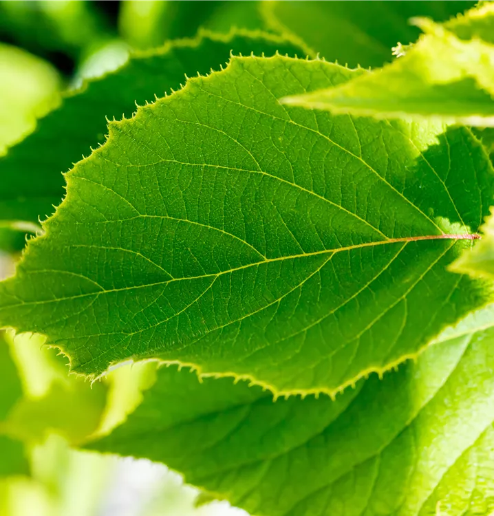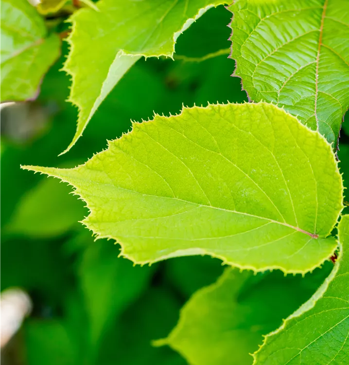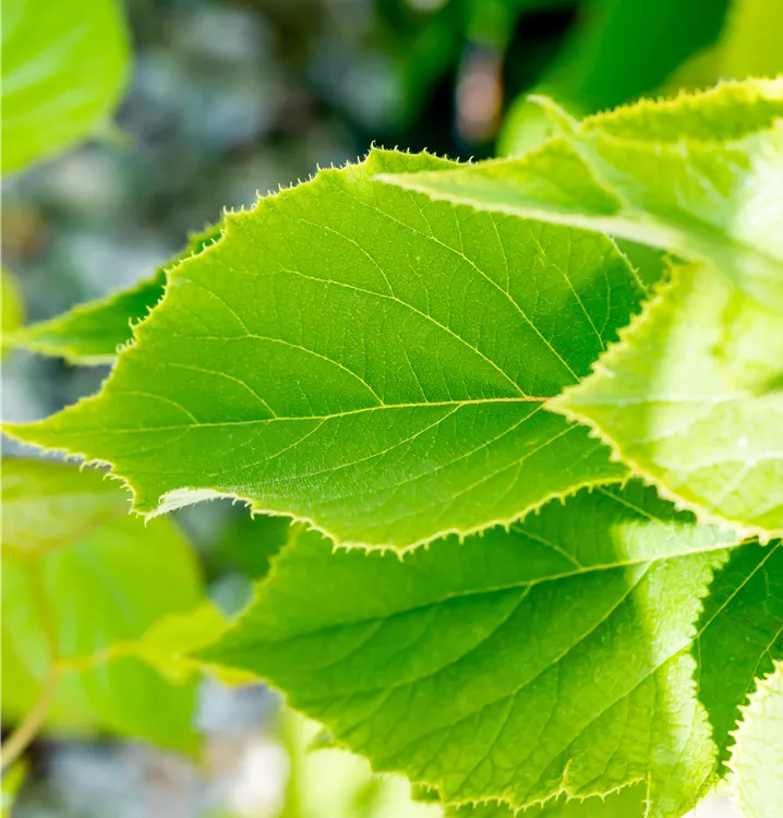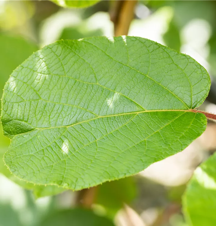 Die sommergrünen Blätter der Kiwi 'Solissimo'® sind dunkelgrün, rundlich, wechselständig. Diese sind etwa 10 - 15 cm groß.