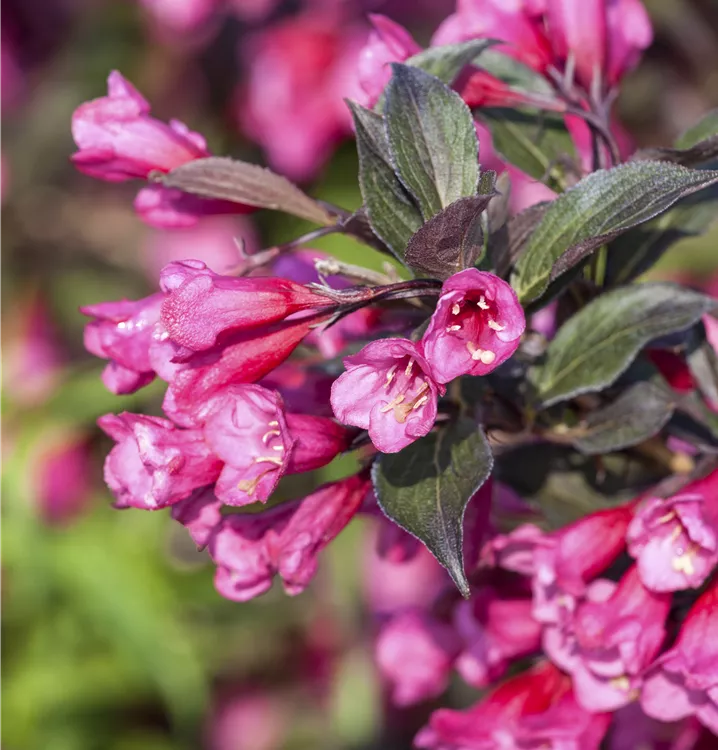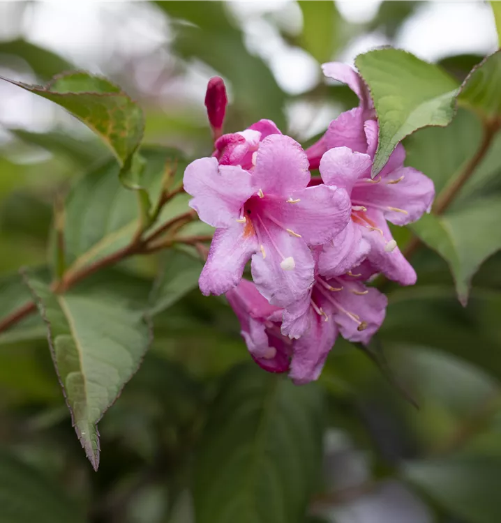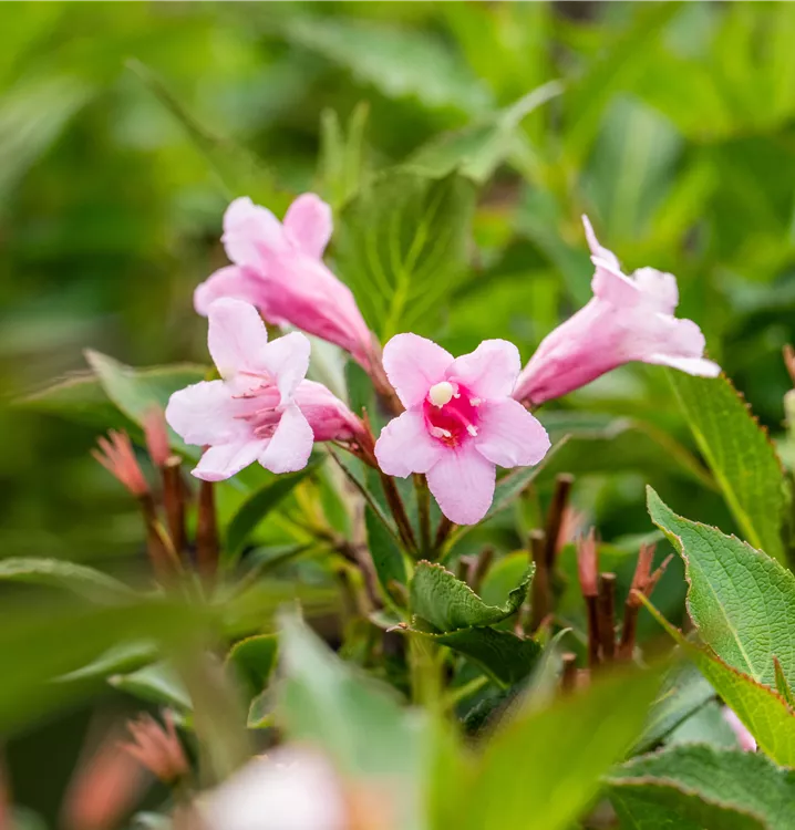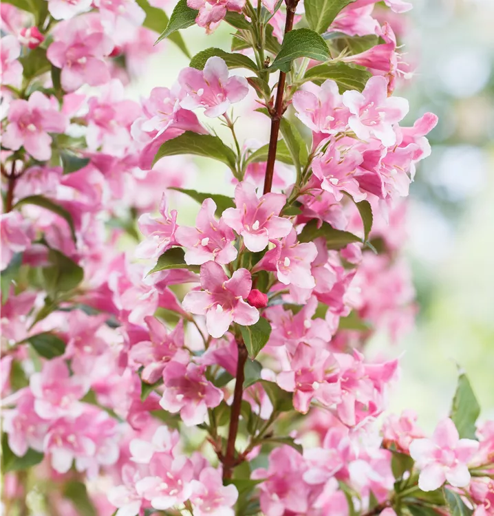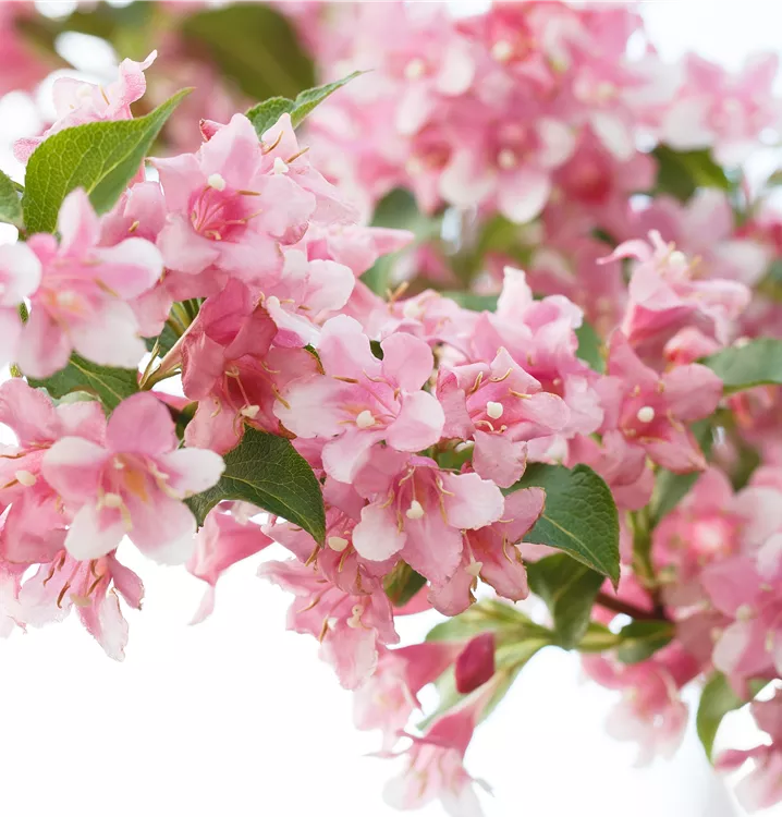 Die Rosa Weigelie (Weigela florida) ist ein buschiger, aufrechter Großstrauch, der rosafarbene, trichterförmige Blüten hervorbringt. Sie erscheinen von Mai bis Juni. Zudem trägt die Rosa Weigelie, eiförmige, hellgrüne Blätter. An einem sonnigen bis halbschattigen Standort mit durchlässigem, nährstoffreichem Boden erreicht sie gewöhnlich eine Höhe von ca. 3,5 m und wird ca. 4 m breit.