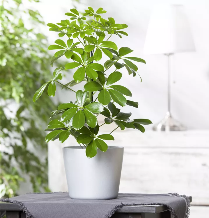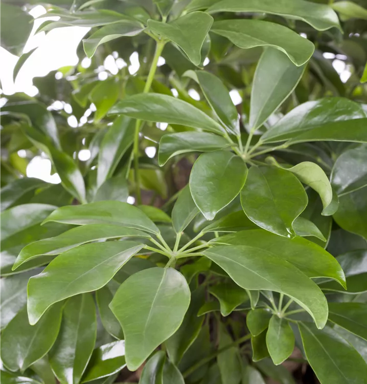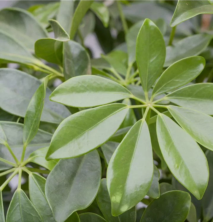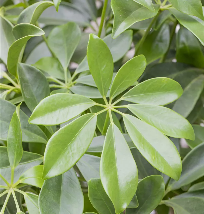 Die Strahlenaralie (Schefflera arboricola) trägt dunkelgrüne, handförmige Blätter. Diese strauchartige Pflanze gedeiht am besten an einem sonnigen bis halbschattigen Standort.