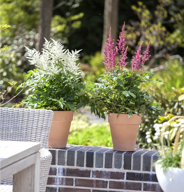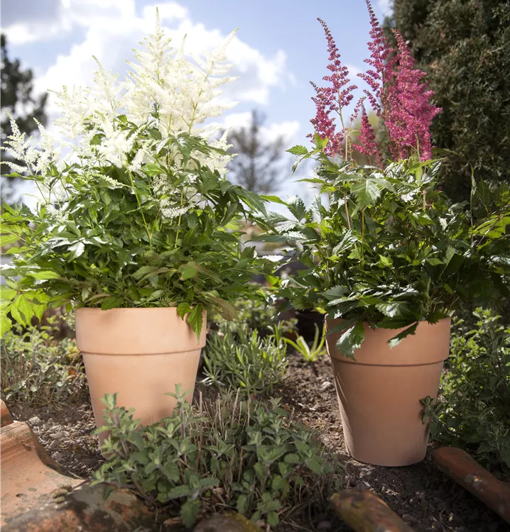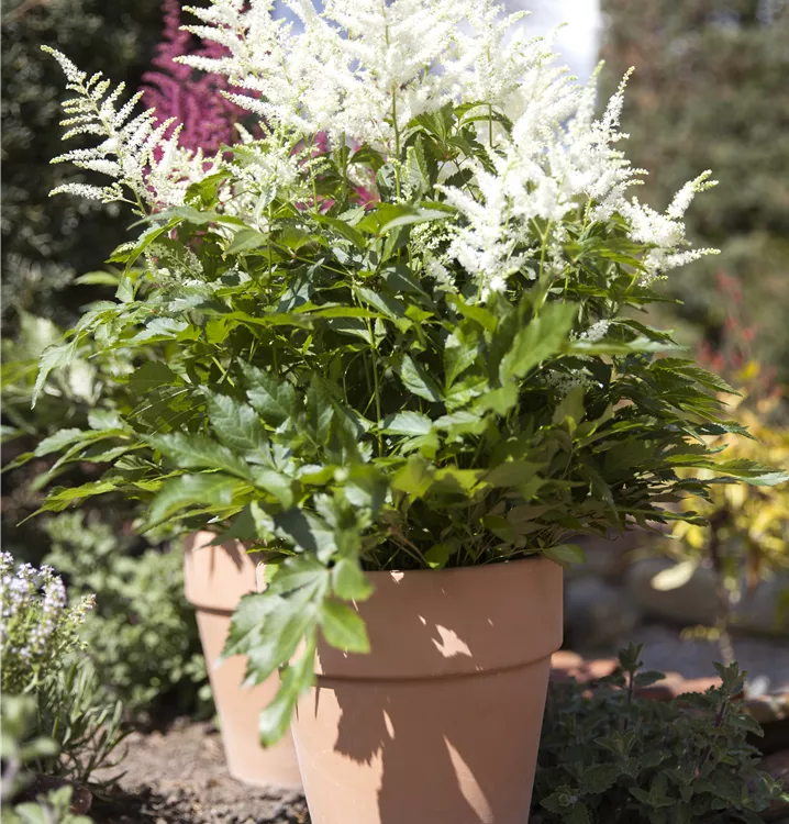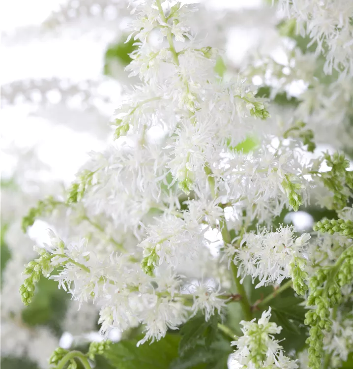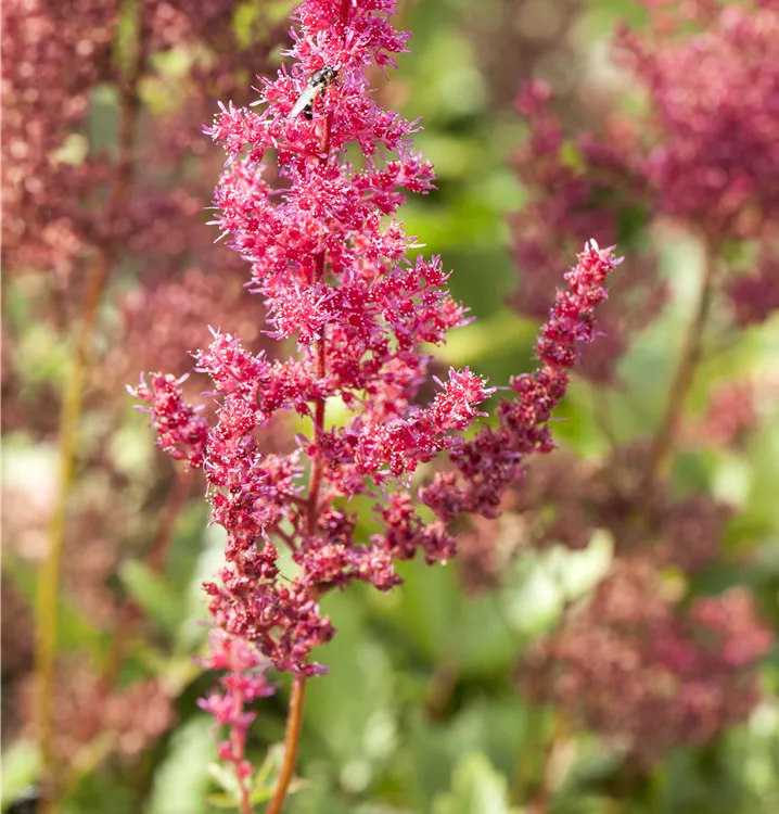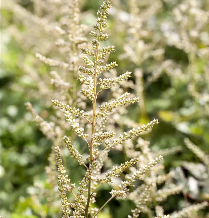 Astilbe x arendsii bildet in Rispen angeordnete, weiße, rosafarbene, rote Blüten ab Juli.