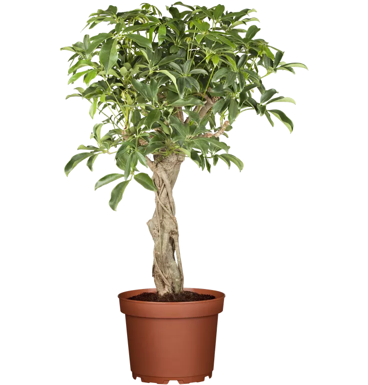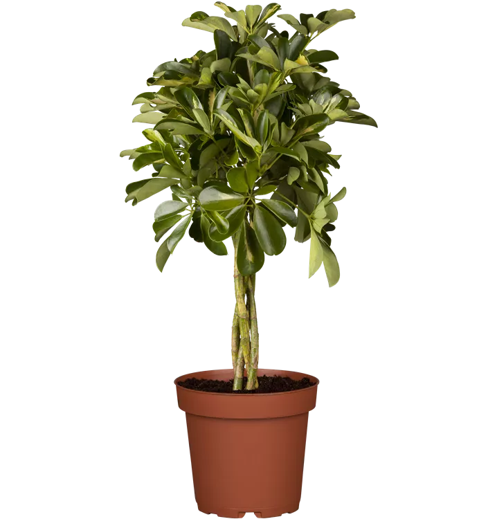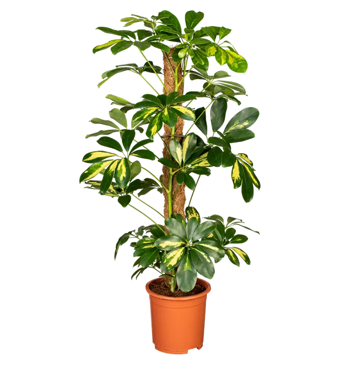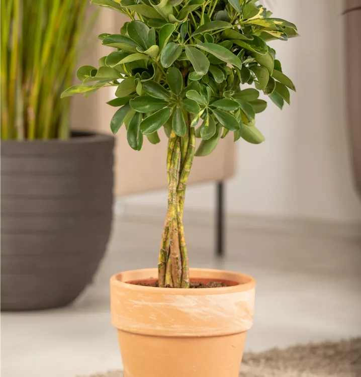 Die Kleine Strahlenaralie 'Gold Capella' (Schefflera arboricola) ist eine Pflanze mit dekorativen, gelb-grünen Blättern. Sie sind handförmig, eiförmig. Diese strauchartige und aufrechte Pflanze gedeiht am besten an einem sonnigen bis halbschattigen Standort.