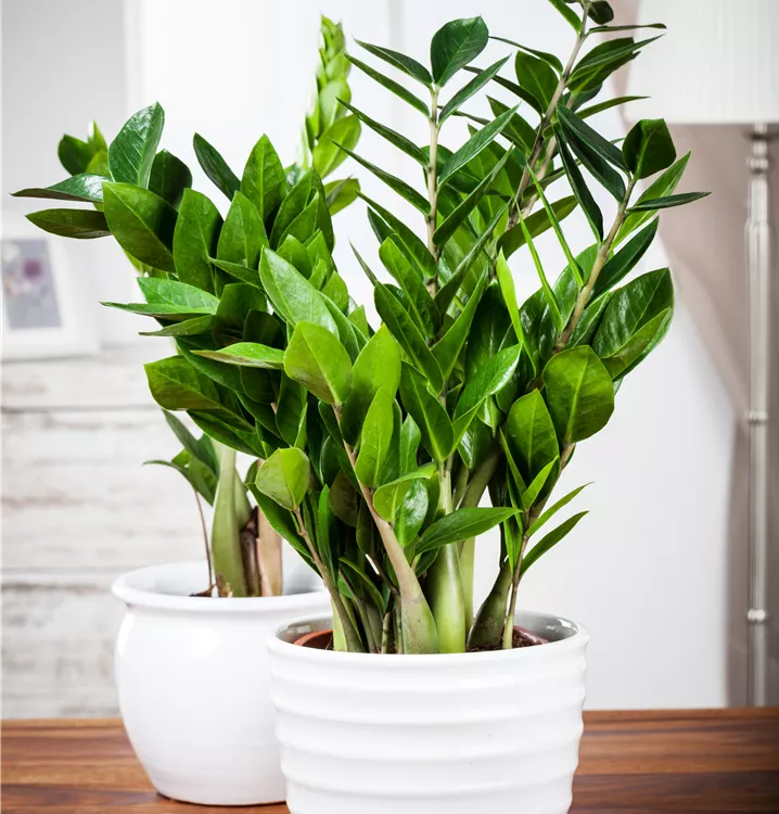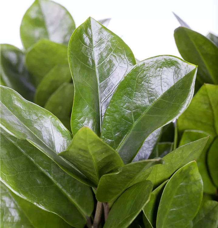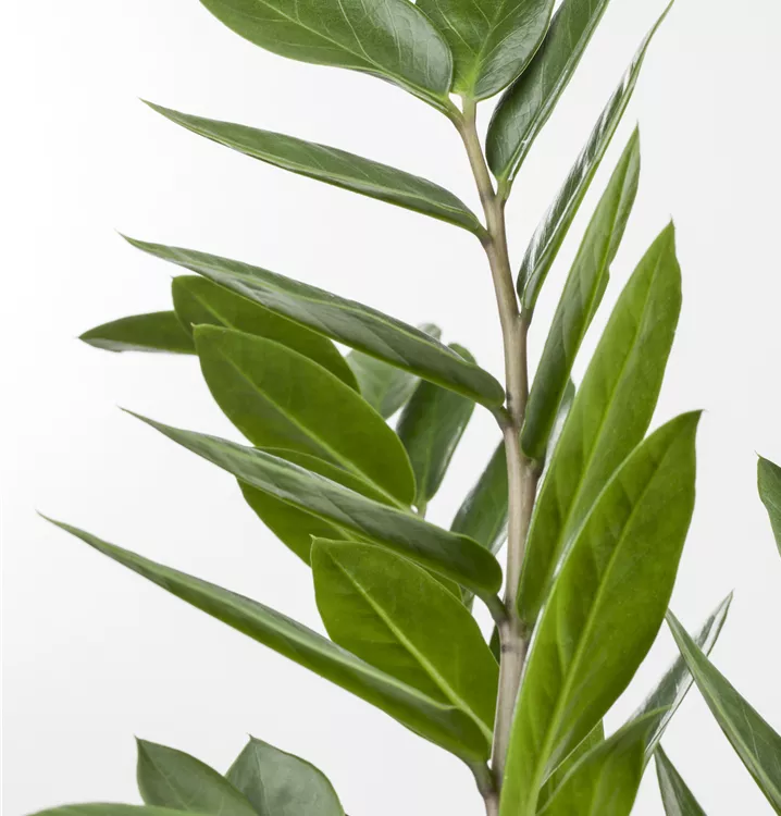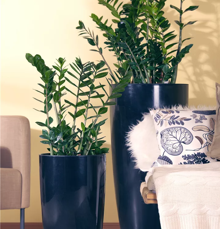 Die Glücksfeder (Zamioculcas zamiifolia) trägt dunkelgrüne Blätter. Diese aufrechte und rhizombildende Pflanze gedeiht am besten an einem schattigen Standort.