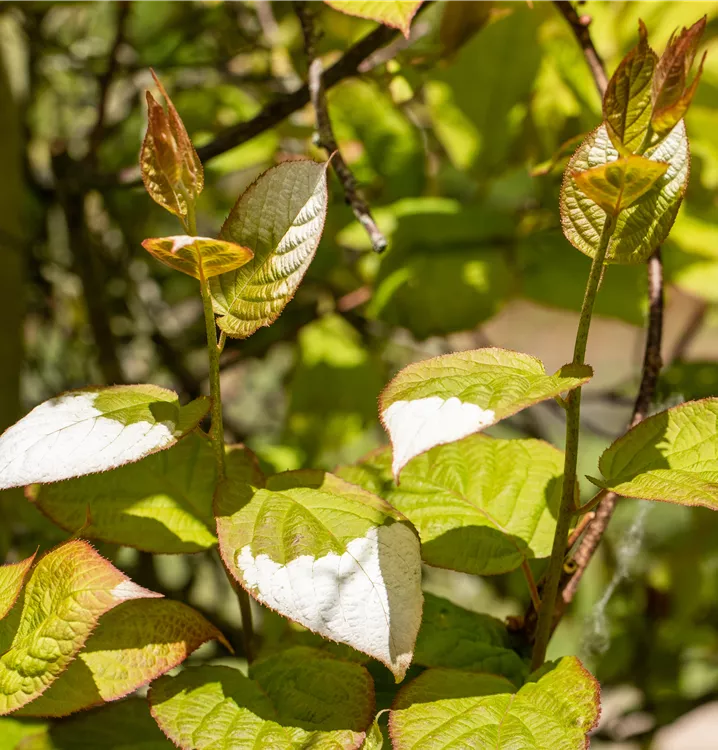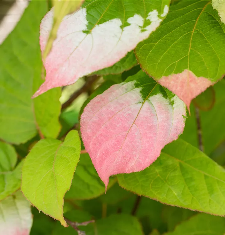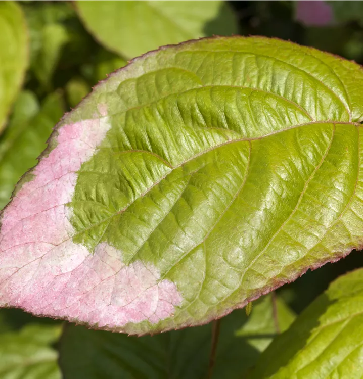 Der Scharfzähnige Strahlengriffel (Actinidia kolomikta) ist eine kletternde, sommergrüne Pflanze mit dekorativen, eiförmigen, mehrfarbigen Blättern. Zudem trägt er im Juni weiße Blüten.An einem sonnigen, windgeschützten Standort mit durchlässigem, humosem, nährstoffreichem Boden erreicht er gewöhnlich eine Höhe von ca. 6 m und wird ca. 3 m breit.